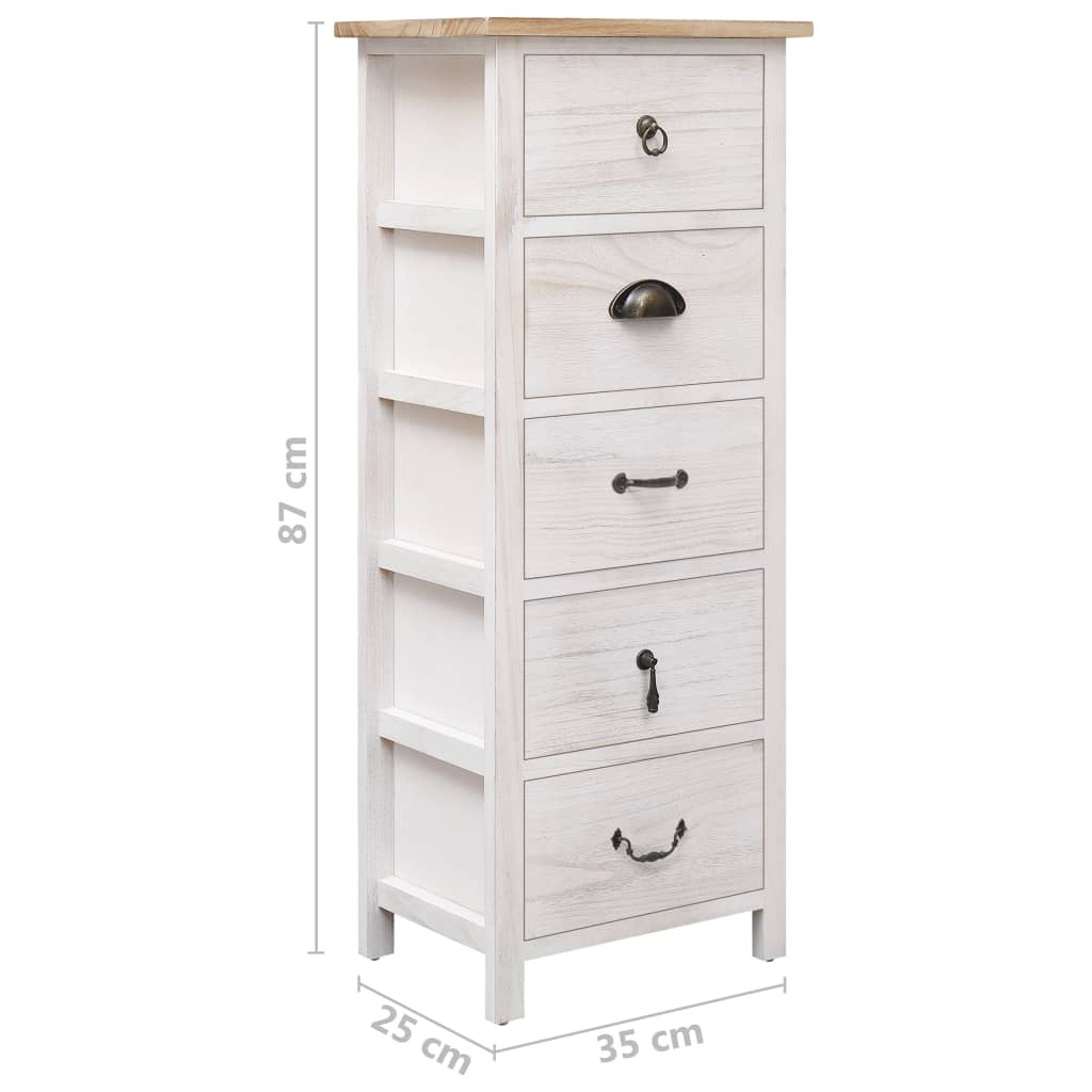 Kisszekrényünk praktikus és egyben mutatós kiegészítője lesz otthonának. Telefonállványként, hálószobai szekrényként stb. is használható. A császárfából készült fiókos szekrény rendkívül tartós és erős. A kisasztal 5 fiókkal bőséges tárolóhelyet biztosít. Emellett a tartós asztallap ideális dísztárgyak, képkeretek vagy cserepes növények elhelyezésére. Nedves ruhával könnyen tisztítható. A kisszekrényt könnyű összeszerelni.