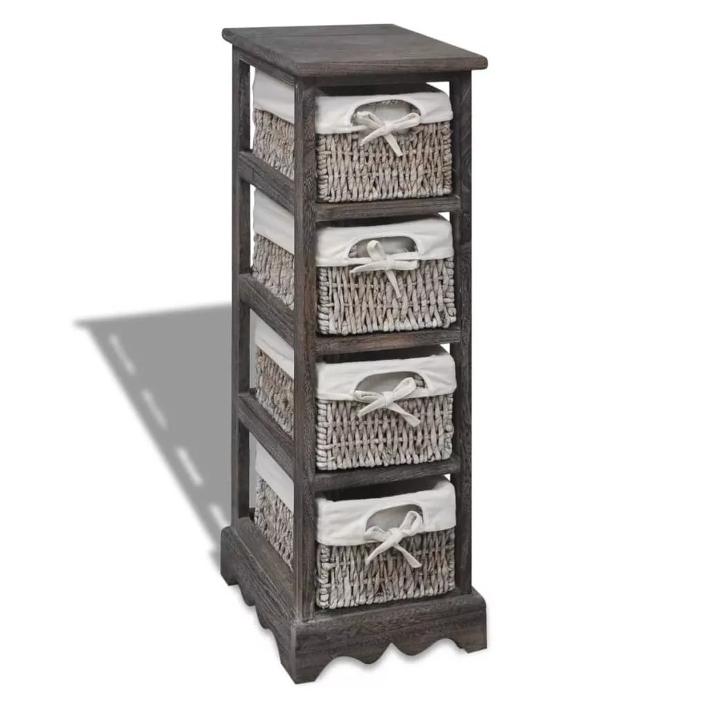 Ez az egyedülálló tároló állvány kiváló minőségű fából készült, amely egyszerű de stílusos kialakítással rendelkezik. Nem csupán tárolóhely tárgyainak, de dekoratív kiegészítője otthonának. Négy szőtt kosárával ez a strapabíró fa tároló bőséges helyet kínál értékei megőrzésére, miközben vidékies stílust csempész a szobájába. Fa tárolónk minden bizonnyal egyik kedvenc bútordarabja lesz otthonában.