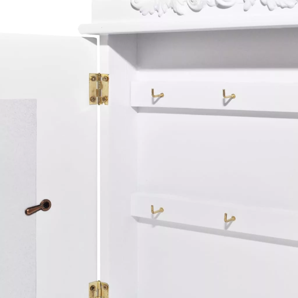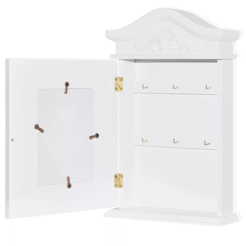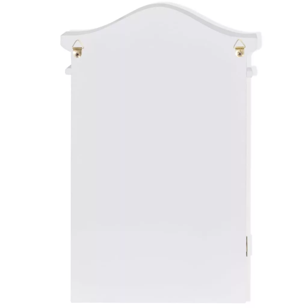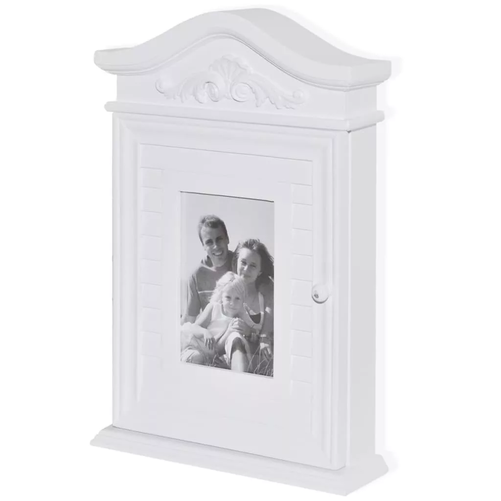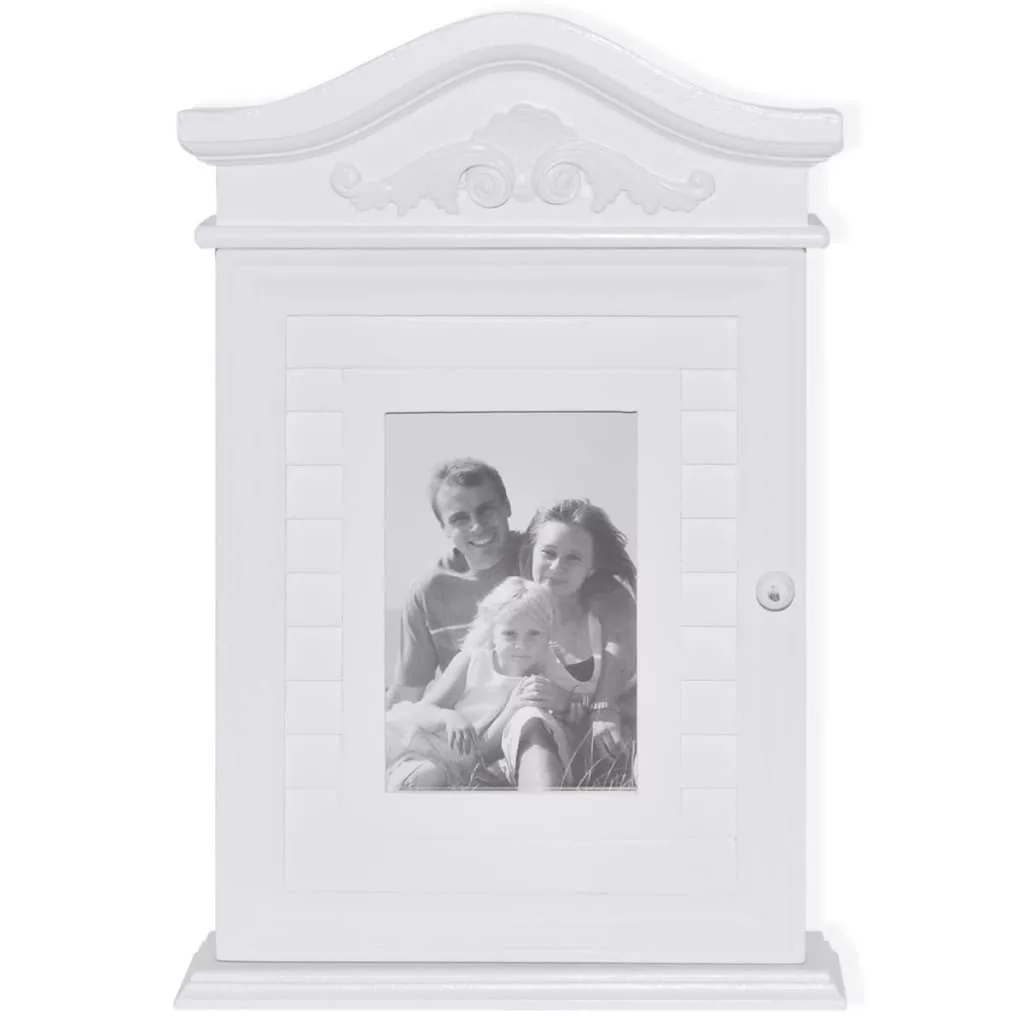 Ez az üveg képkerettel ellátott kulcsos szekrény tökéletes segítőtárs a kulcsok rendszerezéséhez. A szekrény belsejében található hat vaskampó kulcsok vagy egyebek felakasztására szolgál. Könnyen falra szerelhető, kulcsos szekrényünk minden bizonnyal nagyszerű kiegészítője lesz konyhájának, bejáratának és/vagy verandájának. Kulcsszekrényünk kiváló minőségű MDF-ből és fenyőfából készült, és a strapabíró képesség növelése érdekében fehérre lett festve, hogy éveken át kiszolgálja tulajdonosát.