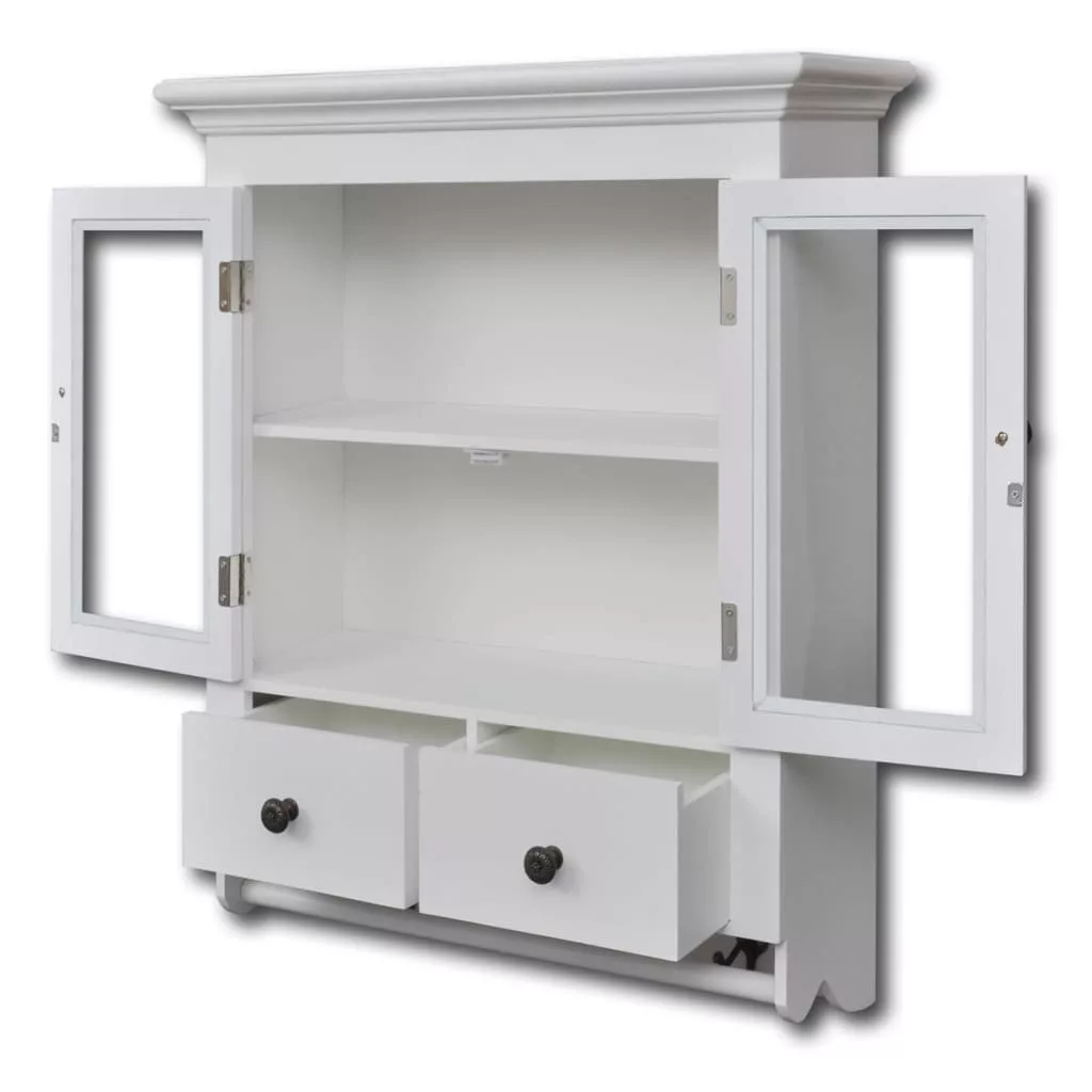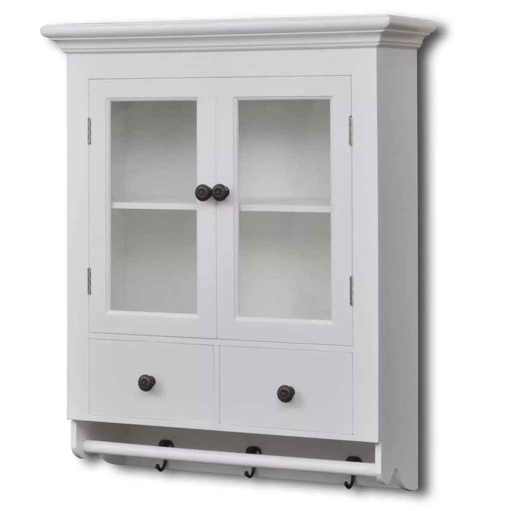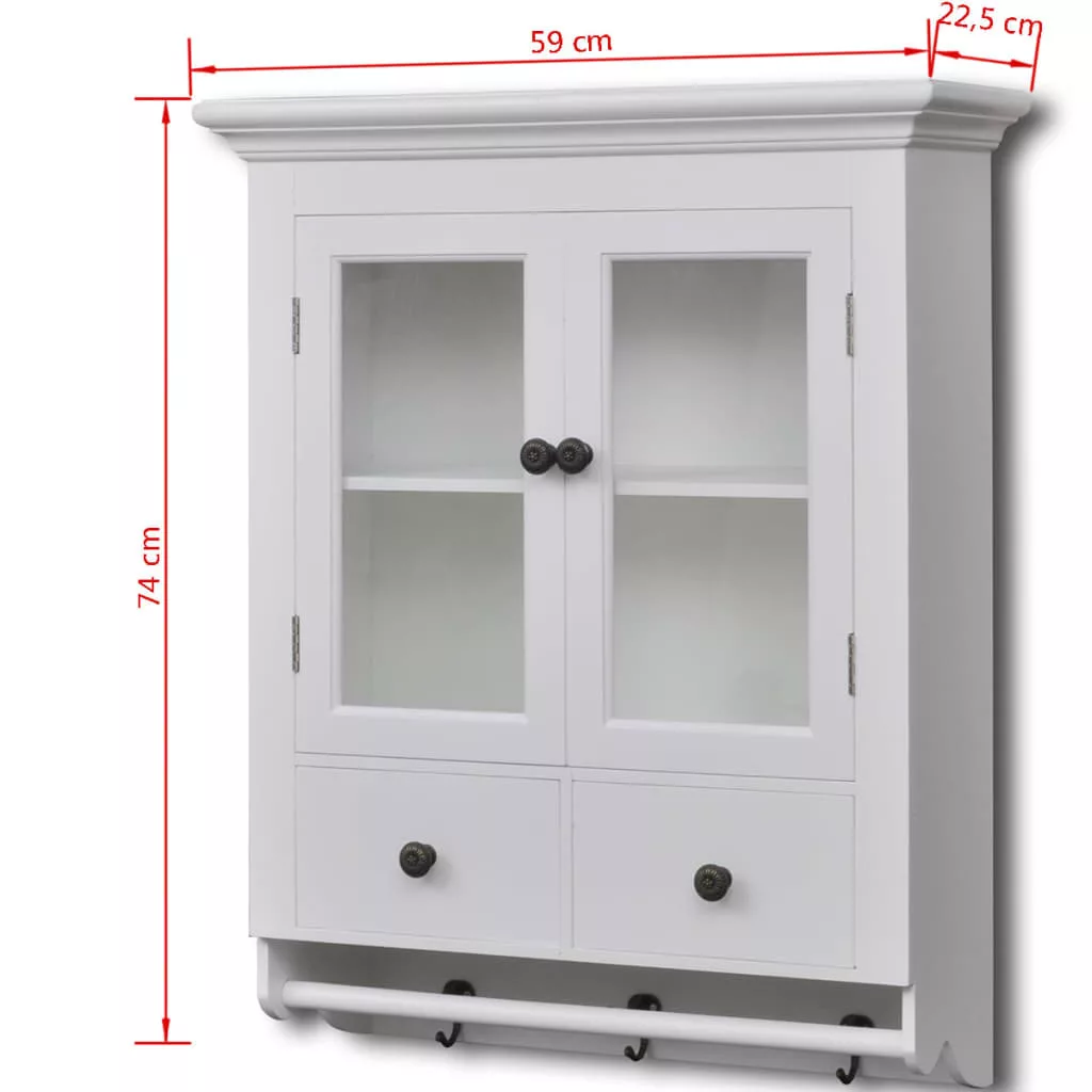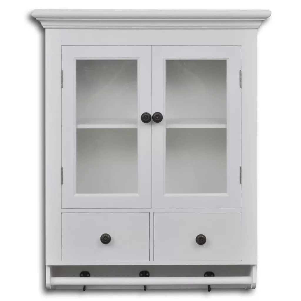 Ez az elegáns, antik megjelenésű fa faliszekrény bőséges tárolóhelyet biztosít a konyhában, és segít a dolgok rendezésében. A szekrény két fiókkal és két polccal rendelkezik, így könnyen tárolhat gabonaféléket, fűszereket, konzerveket és még sok mást. 2 üvegajtóval és 2 könnyen nyitható fiókkal lett felszerelve, így gyorsan beszerezheti a szükséges dolgokat. A horgok és szegek bögrékhez vagy törlőkhöz használhatók. Kiváló minőségű fából készült, ez a szekrény úgy készült, hogy ellenálljon a nedves környezetnek. A fehérre festett felület nedves ruhával könnyedén tisztítható.