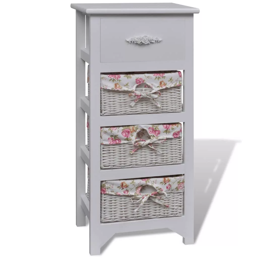 Ez a kiváló minőségű fából készült, egy fiókos és három kosaras faszekrény egyszerű, mégis stílusos kialakítású. Nem csak a dolgait fogja tárolni, hanem romantikus hangulatot visz a dekorációba. Egy fiókkal és három kosárral ez a strapabíró fa szekrény bőséges helyet biztosít értékei tárolására. Favázának masszív teteje van, amelyre dísztárgyakat helyezhet. Fából készült szekrényünk minden helyiségben szemet gyönyörködtető lesz. Figyelem! A felborulás elkerülése érdekében ezt a terméket a mellékelt fali rögzítőeszközzel kell használni.