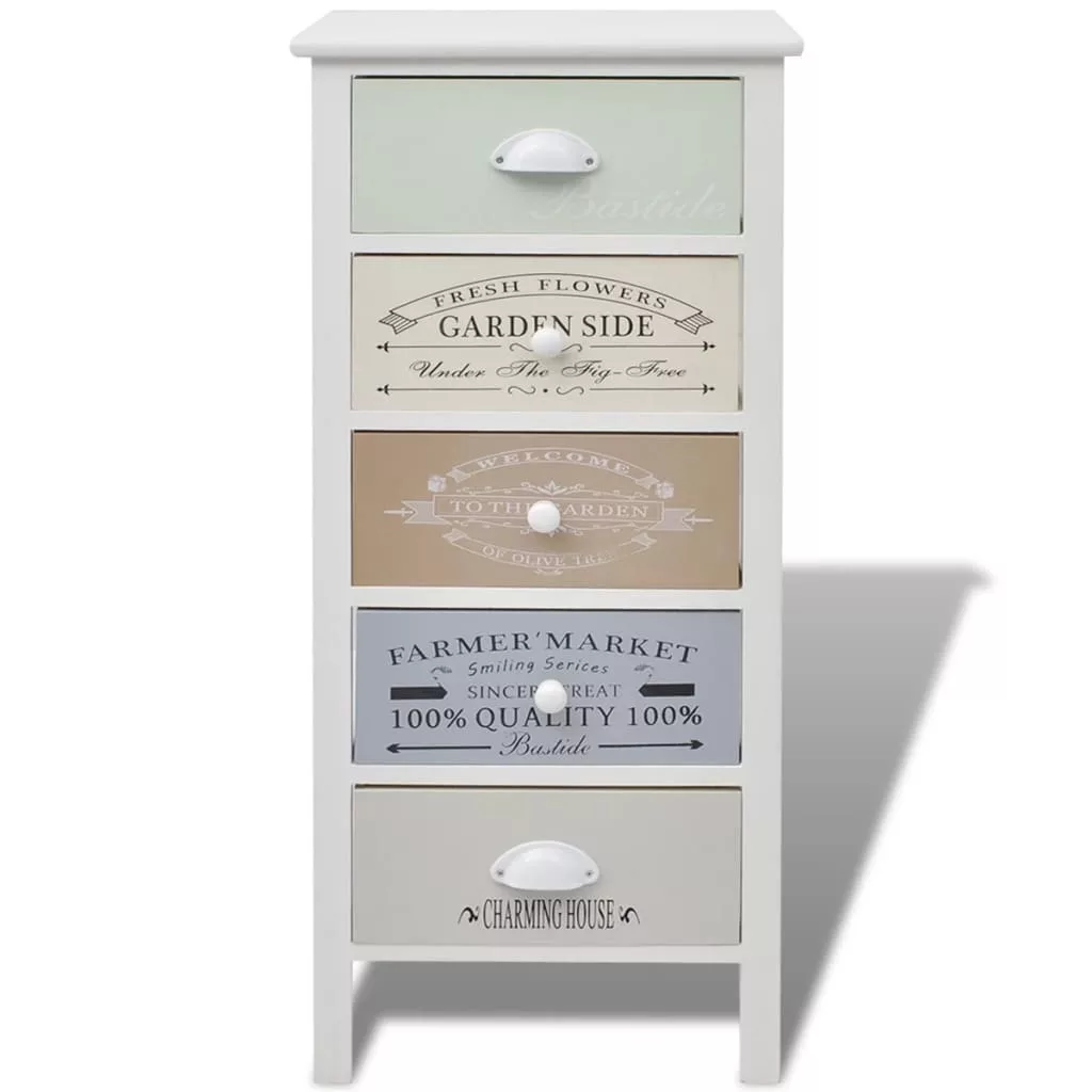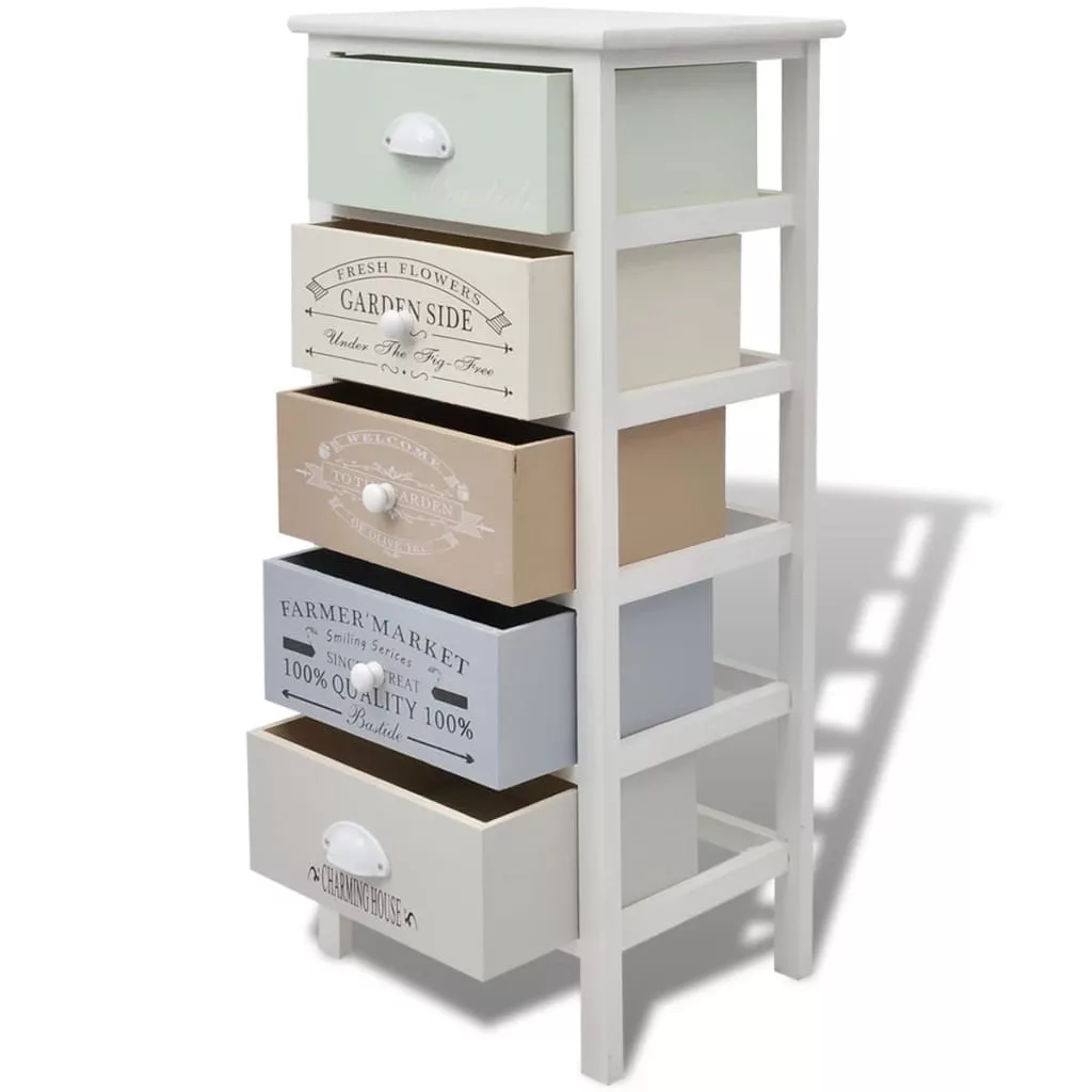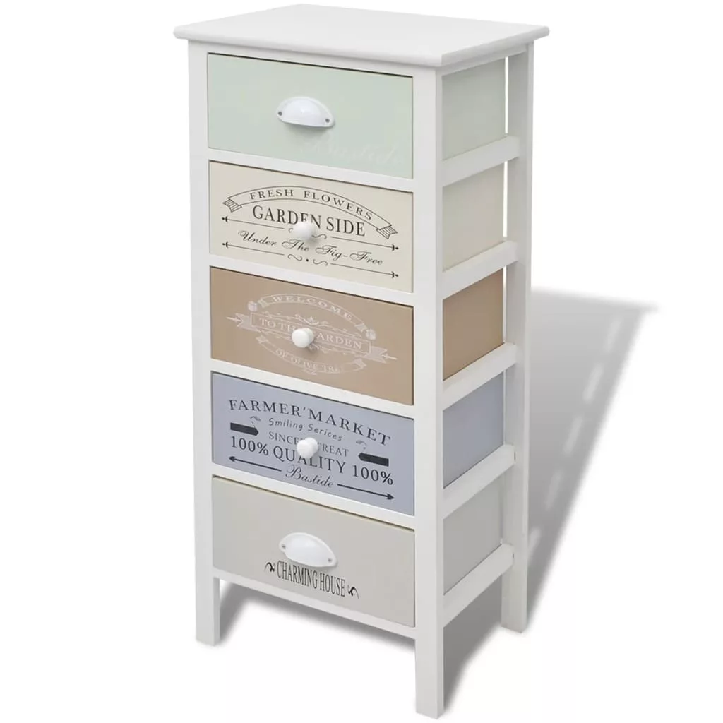 Adjon egy csipetnyi rusztikus bájt otthonának ezzel az elegáns, klasszikus francia vidéki stílusú, fából készült tárolószekrénnyel! Ezt fiókos szekrényt 5 zökkenőmentesen kihúzható fiókkal szerelték fel, így bőséges tárolóhelyet kínál személyes tárgyai számára, és segít rendben tartani szobáját. A fiókokat vintage stílusú lenyomatokkal díszítették, így rusztikus bájt adnak a szekrénynek. A fiókok cserélhetők. Az előszoba szekrény tetejére képeket, könyveket és cserepes növényeket is helyezhet. Kiváló minőségű anyagokból készült, így ez a szekrény tartós és könnyen tisztítható.