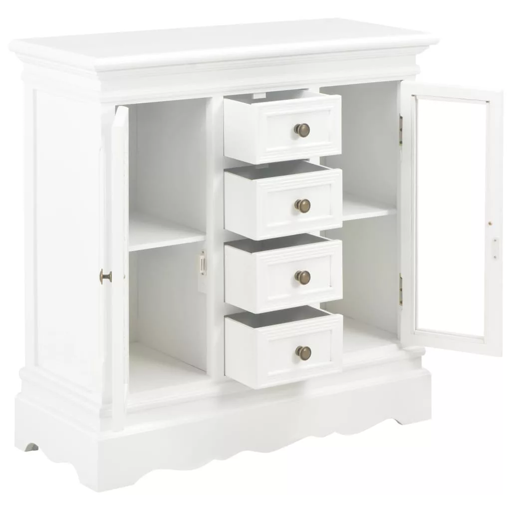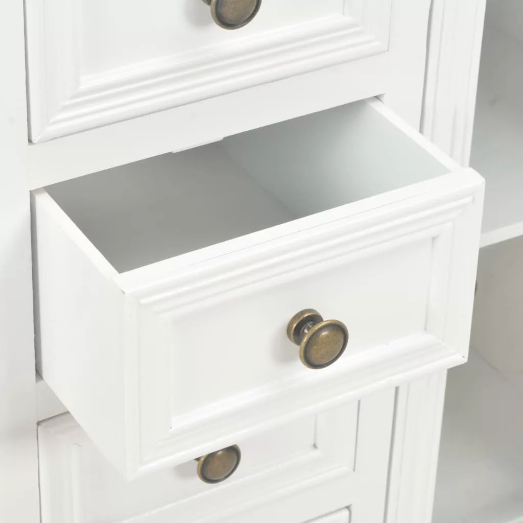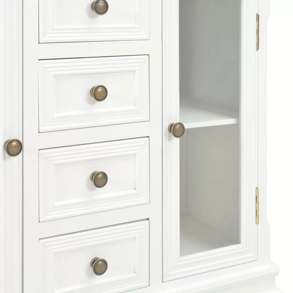 Vigyen otthonába egy csipetnyi eleganciát ezzel a klasszikus tálalószekrénnyel! Ez a francia stílusú tálalószekrény bőséges tárolóhelyet biztosít. Nappalija, hálószobája vagy előszobája praktikus és dekoratív kiegészítője lesz. A kisszekrény MDF-ből és tömör fenyőfából készült, így rendkívül robusztus és tartós. A fa szekrény 4 fiókkal és 2 akrilajtóval ellátott tárolórekesszel rendelkezik a bőséges tárolóhely érdekében. Emellett a klasszikus stílusú fogantyúk kiemelik a tárolószekrény vintage stílusát. A termék összeszerelése egyszerű. Tegye szebbé otthonát egyszerű, mégis elegáns tálalószekrényünkkel!
