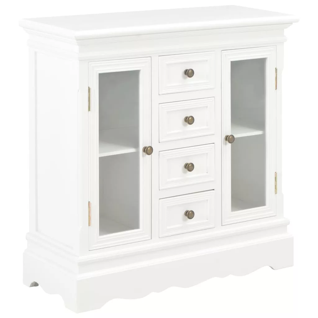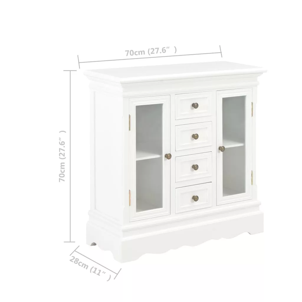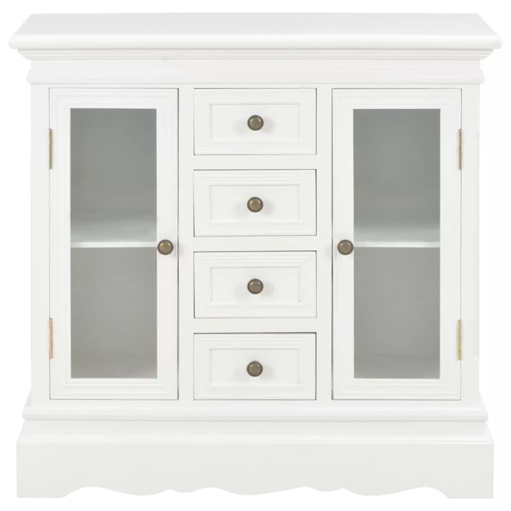 Vigyen otthonába egy csipetnyi eleganciát ezzel a klasszikus tálalószekrénnyel! Ez a francia stílusú tálalószekrény bőséges tárolóhelyet biztosít. Nappalija, hálószobája vagy előszobája praktikus és dekoratív kiegészítője lesz. A kisszekrény MDF-ből és tömör fenyőfából készült, így rendkívül robusztus és tartós. A fa szekrény 4 fiókkal és 2 akrilajtóval ellátott tárolórekesszel rendelkezik a bőséges tárolóhely érdekében. Emellett a klasszikus stílusú fogantyúk kiemelik a tárolószekrény vintage stílusát. A termék összeszerelése egyszerű. Tegye szebbé otthonát egyszerű, mégis elegáns tálalószekrényünkkel!