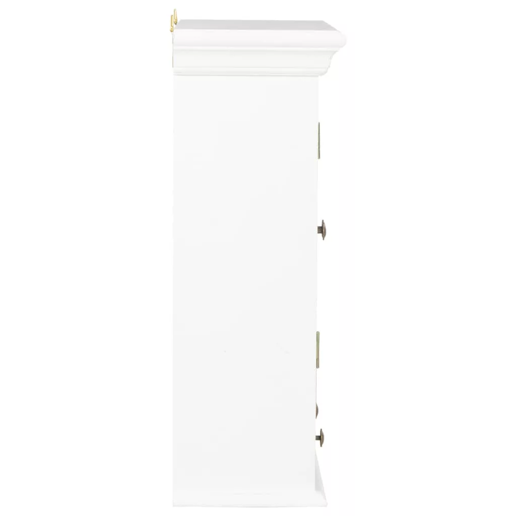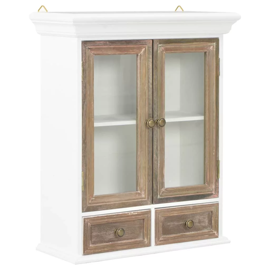 Ez a többcélú francia stílusú faliszekrényt a konyhában használható fűszerek, konzervek és egyéb dolgok tárolására, a fürdőszobában a törölközők rendezetten tartására, és a nappaliban a könyvek, díszek és egyéb tárgyak megjelenítésere. Ez a landhouse stílusú függőszekrény szerelt fából készült, ami le lett festve, így a szekrény kifinomult megjelenésű, és nedves ruhával könnyen tisztítható. A fali szekrény két fiókkal és két könnyen nyitható akrilajtóval rendelkezik, amelyek extra tárhelyet biztosítanak. Emellett a klasszikus stílusú fogantyúk kiemelik a tárolószekrény vintage stílusát. A rögzítési rendszernek köszönhetően a felakasztható szekrény könnyen a falra rögzíthető. A termék könnyen összeszerelhető. Ne használja ezt az elemet, ha valamelyik alkatrésze eltört, elszakadt vagy hiányzik.