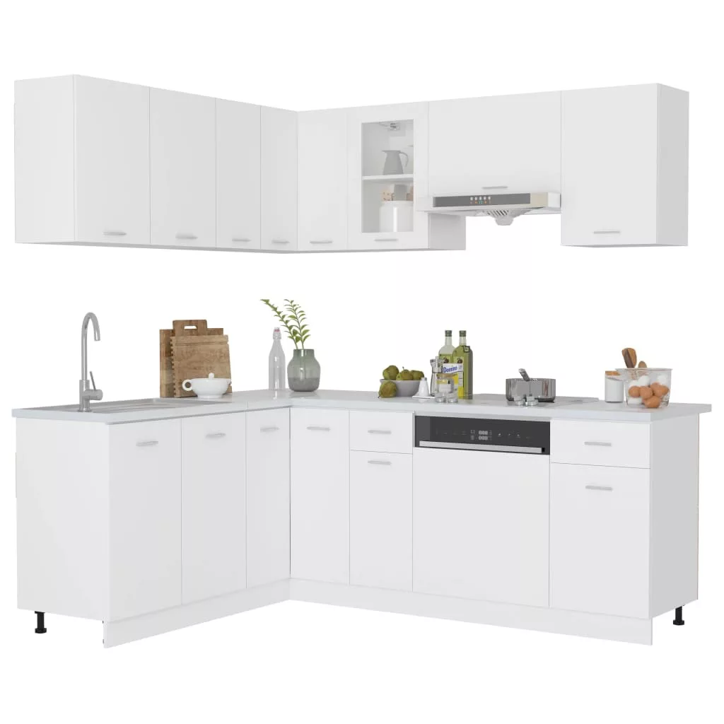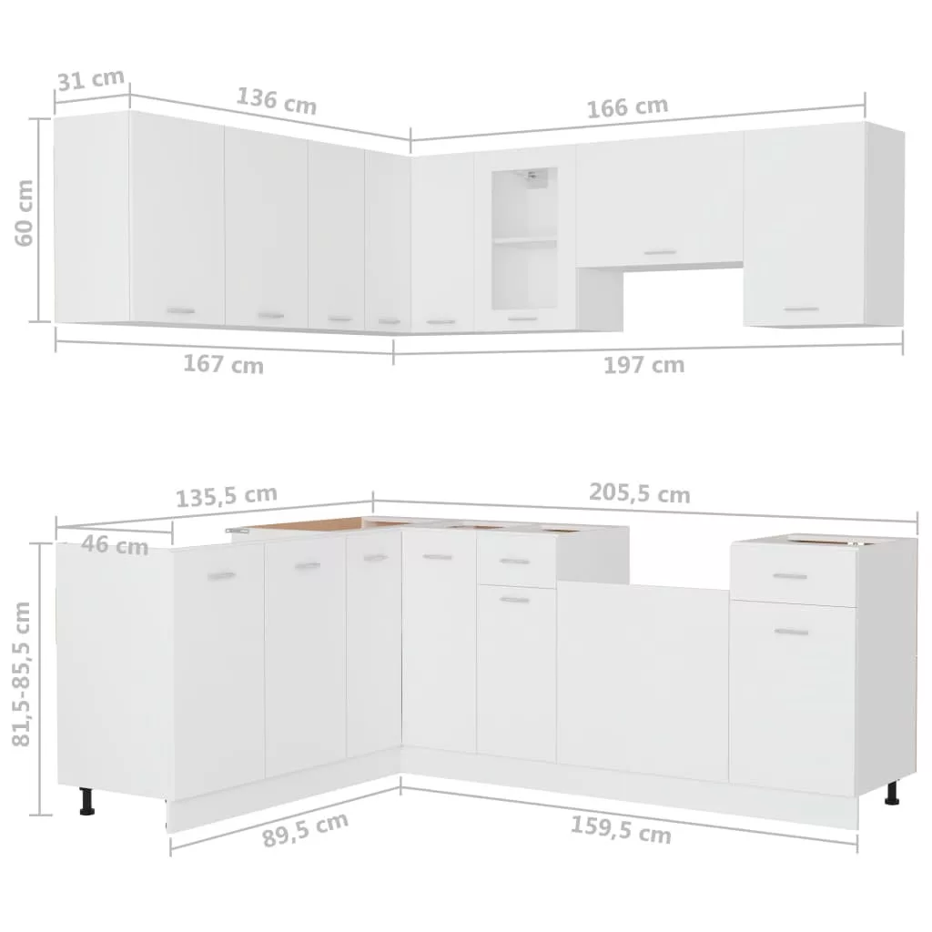 Ez az elegáns kialakítású, tizenegy részes konyhai szekrénygarnitúra optimalizálja konyhája terét, és bőséges tárolóhelyet biztosít személyes tárgyainak! Ezek a szekrények strapabíróak és praktikusak, így rendezetten tartják konyháját, valamint elegendő helyet biztosítanak a tálak, tányérok, fazekak és egyéb konyhai eszközök számára. A mosogatógéppanel egyszerű kivitelezésű, és megóvja a mosogatógépet. Emellett ez a garnitúra nedves ruhával könnyen tisztítható. Kérjük, vegye figyelembe, hogy a csomag munkapultot, elektromos készülékeket, csapot és mosdókagylót nem tartalmaz.