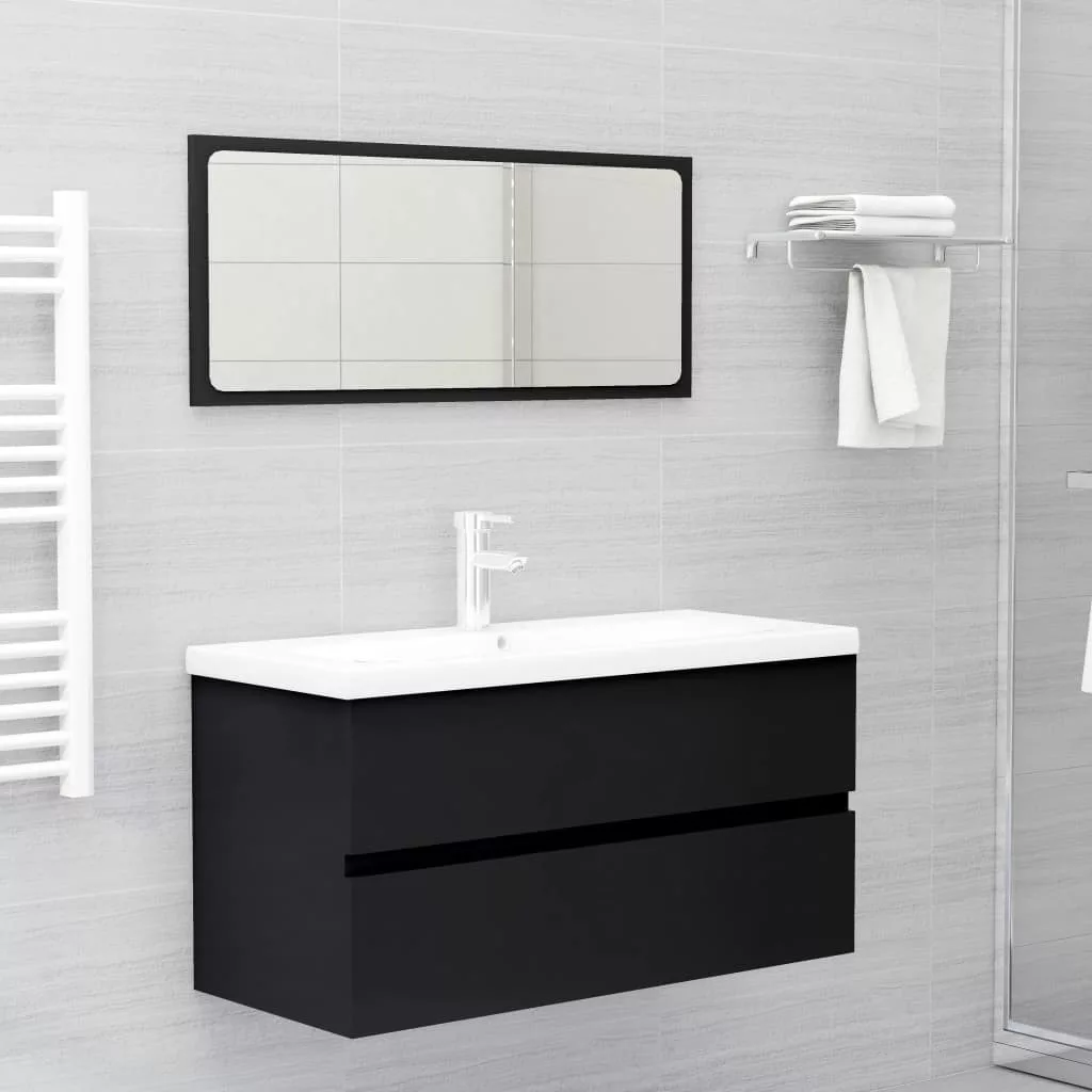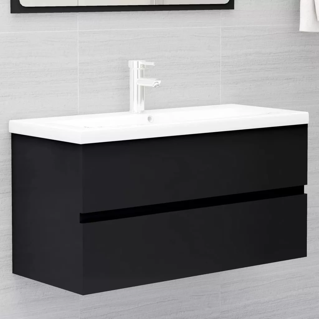 fekete szerelt fa mosdószekrény beépített mosdókagylóval