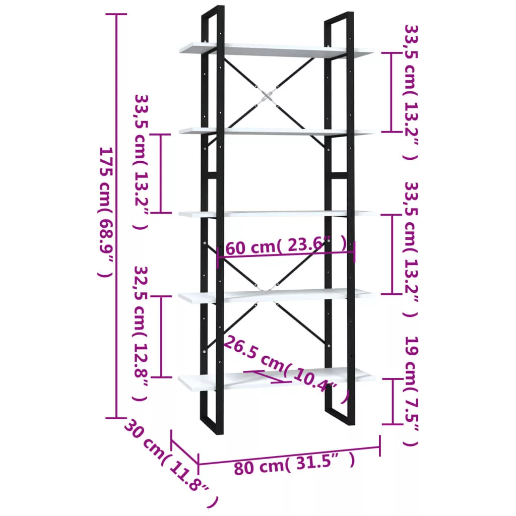 5 szintes fehér szerelt fa könyvszekrény 80 x 30 x 175 cm