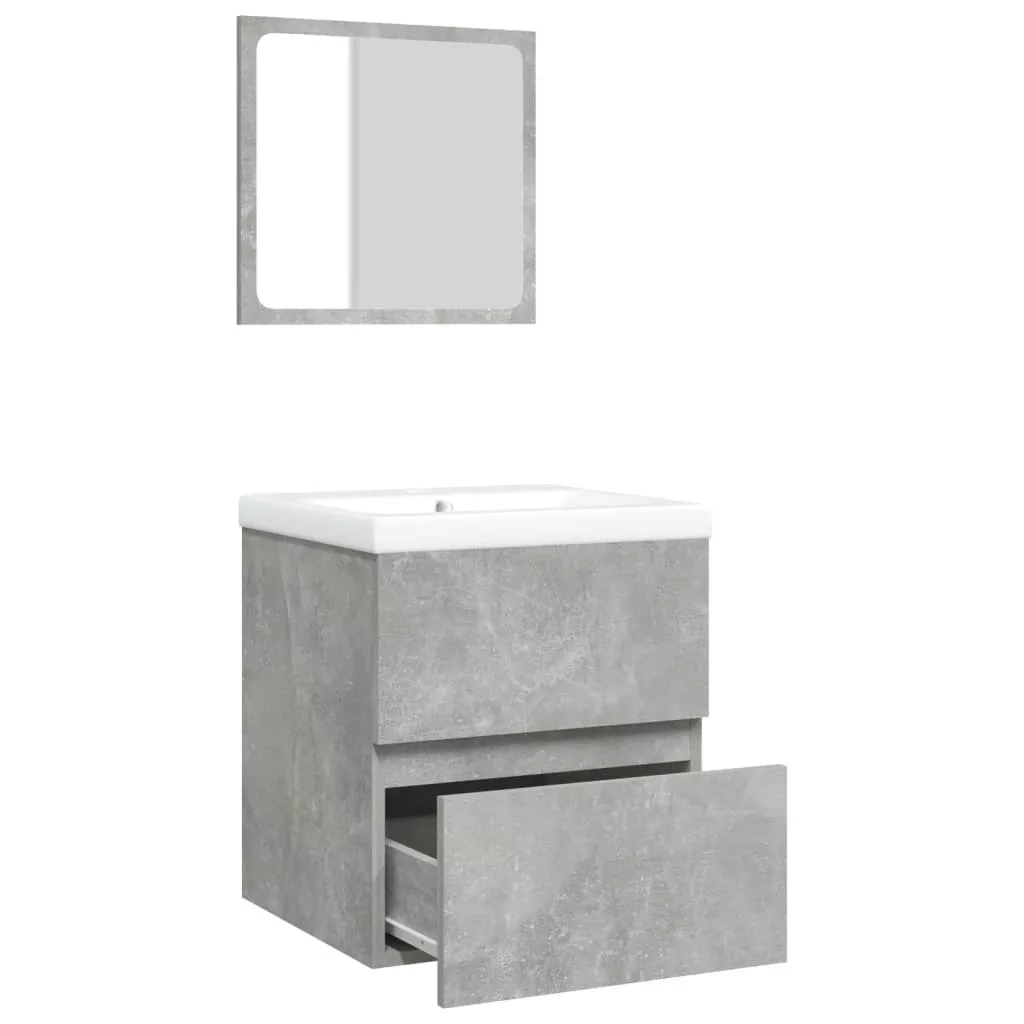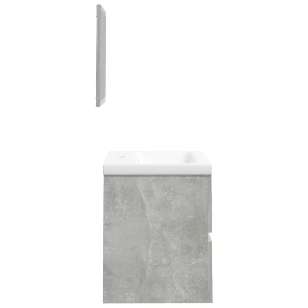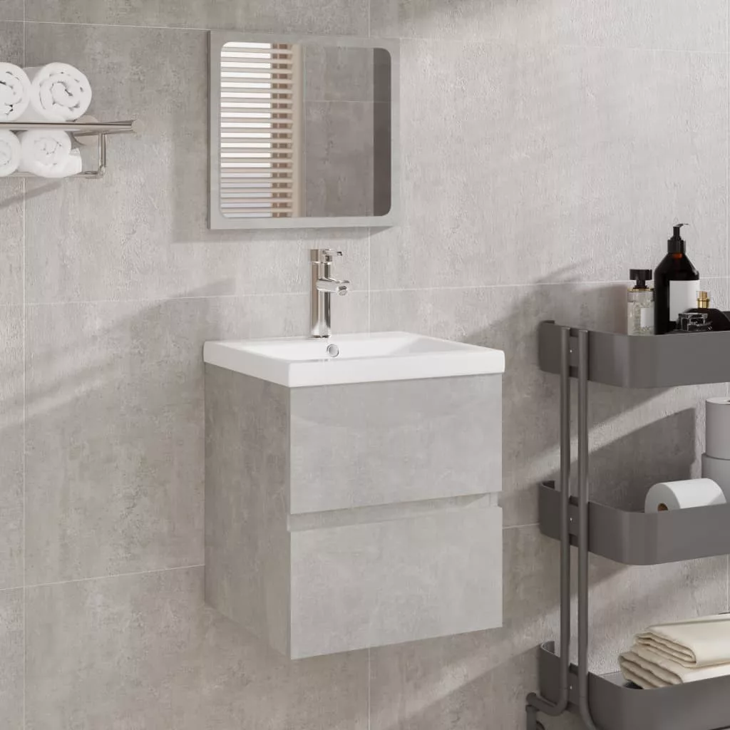 betonszürke fürdőszobai mosdószekrény mosdóval és tükörrel