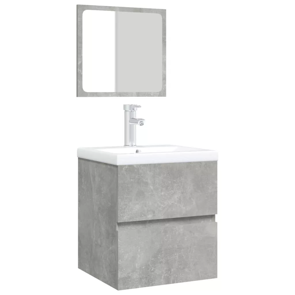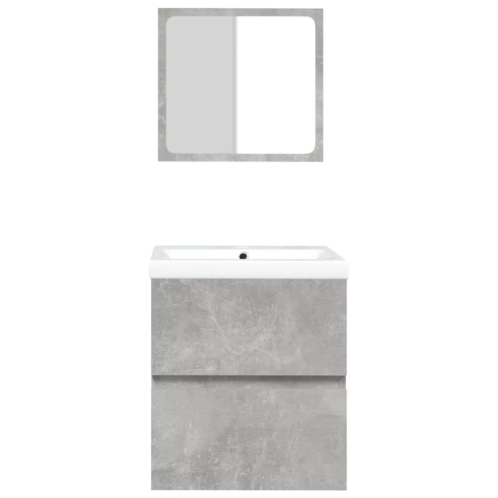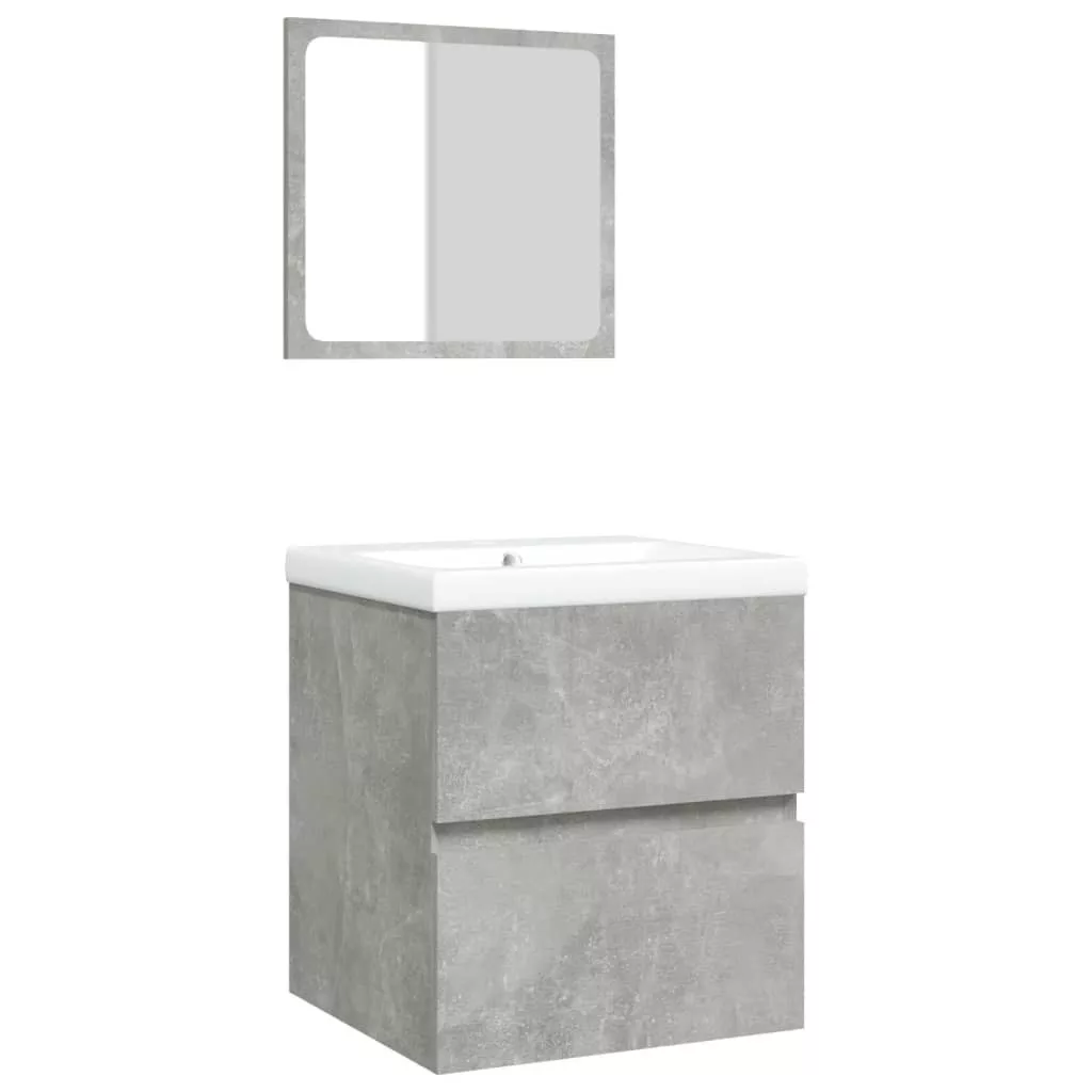 betonszürke fürdőszobai mosdószekrény mosdóval és tükörrel
