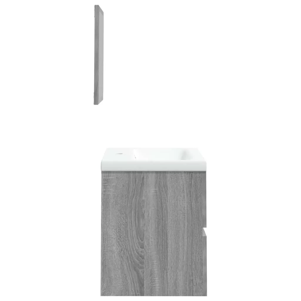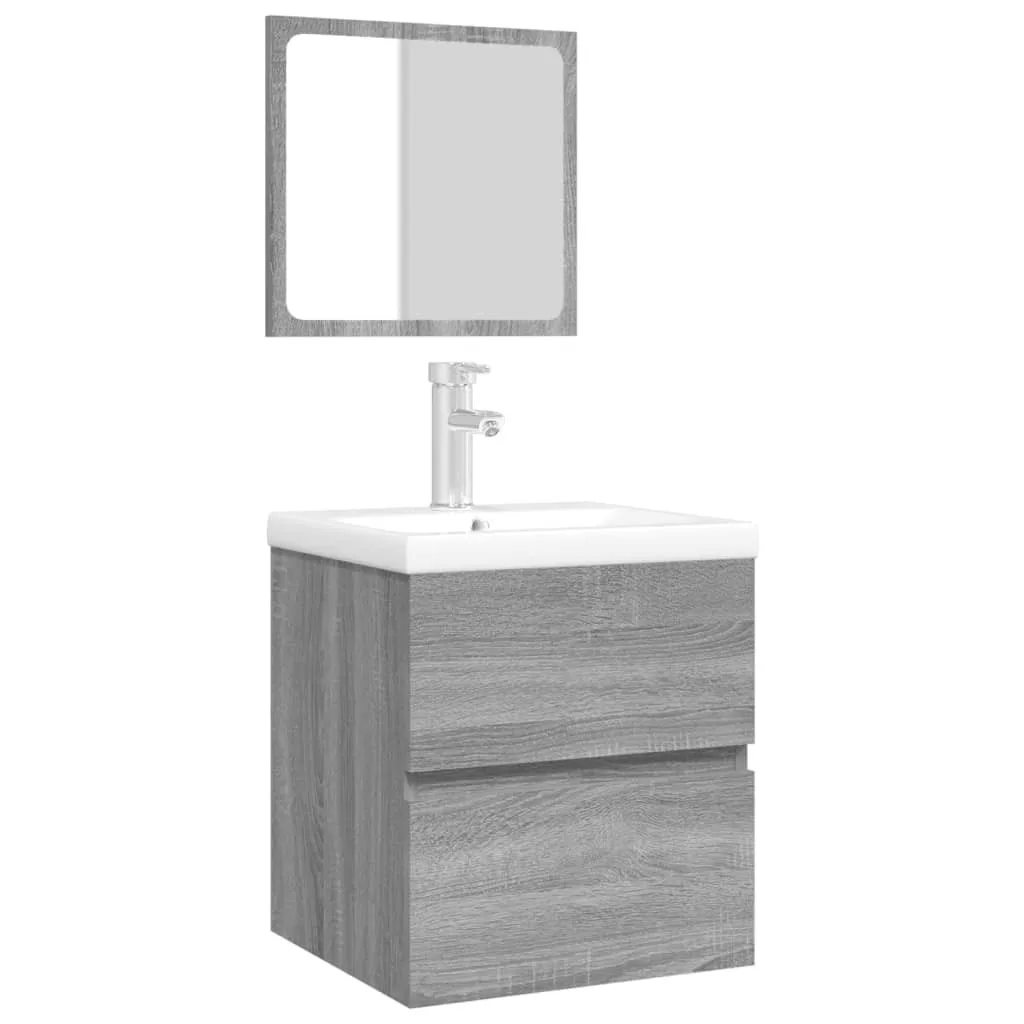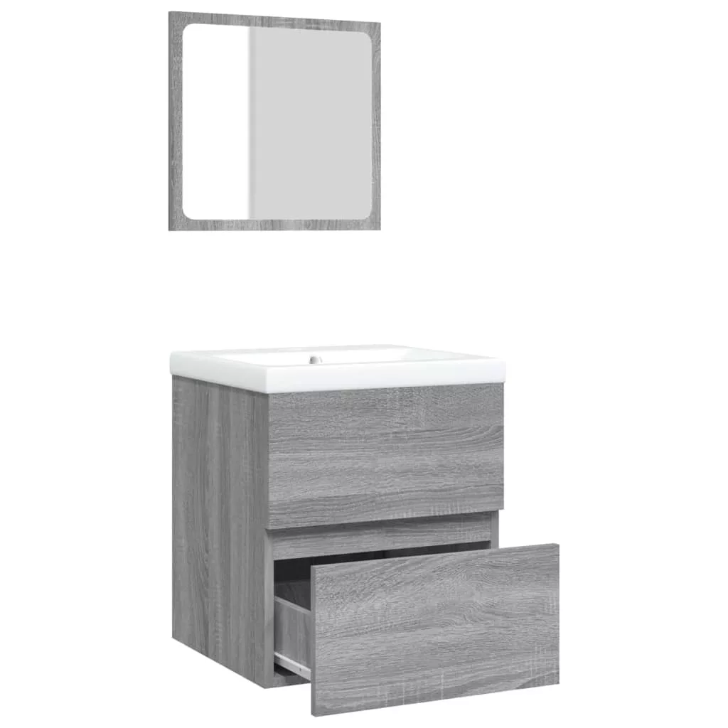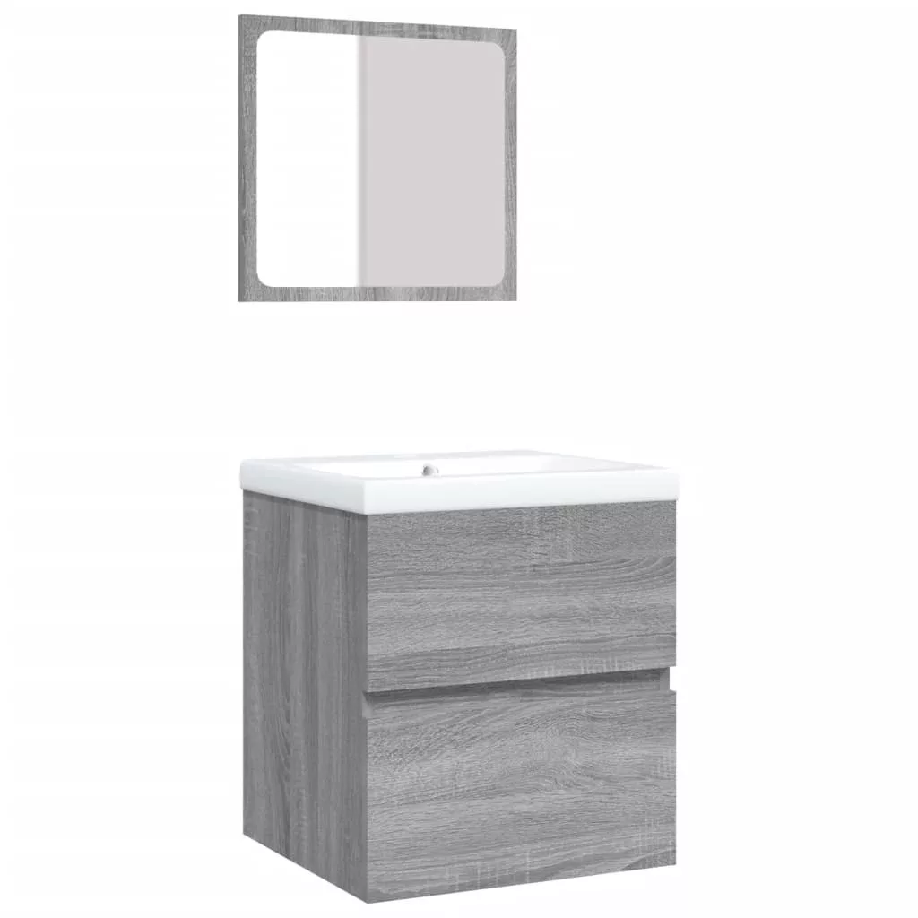 szürke sonoma fürdőszobai mosdószekrény mosdóval és tükörrel