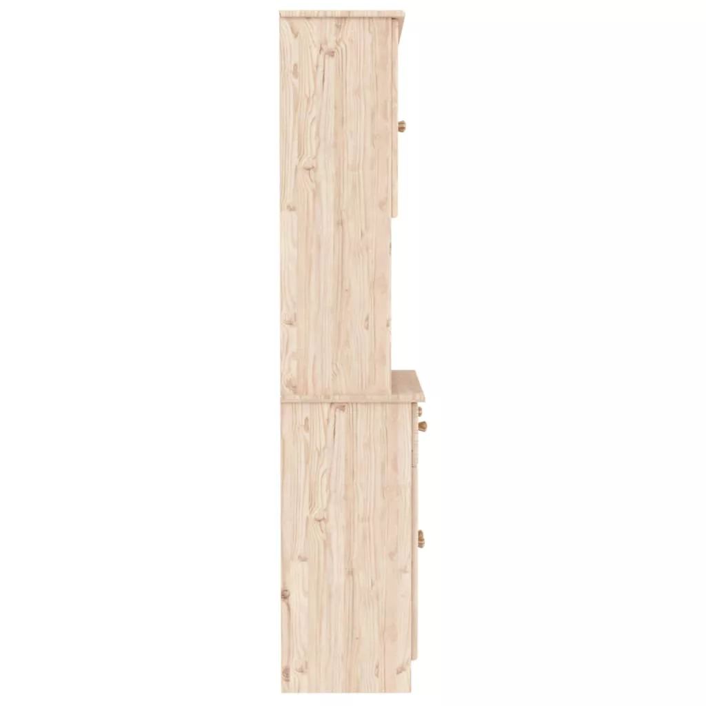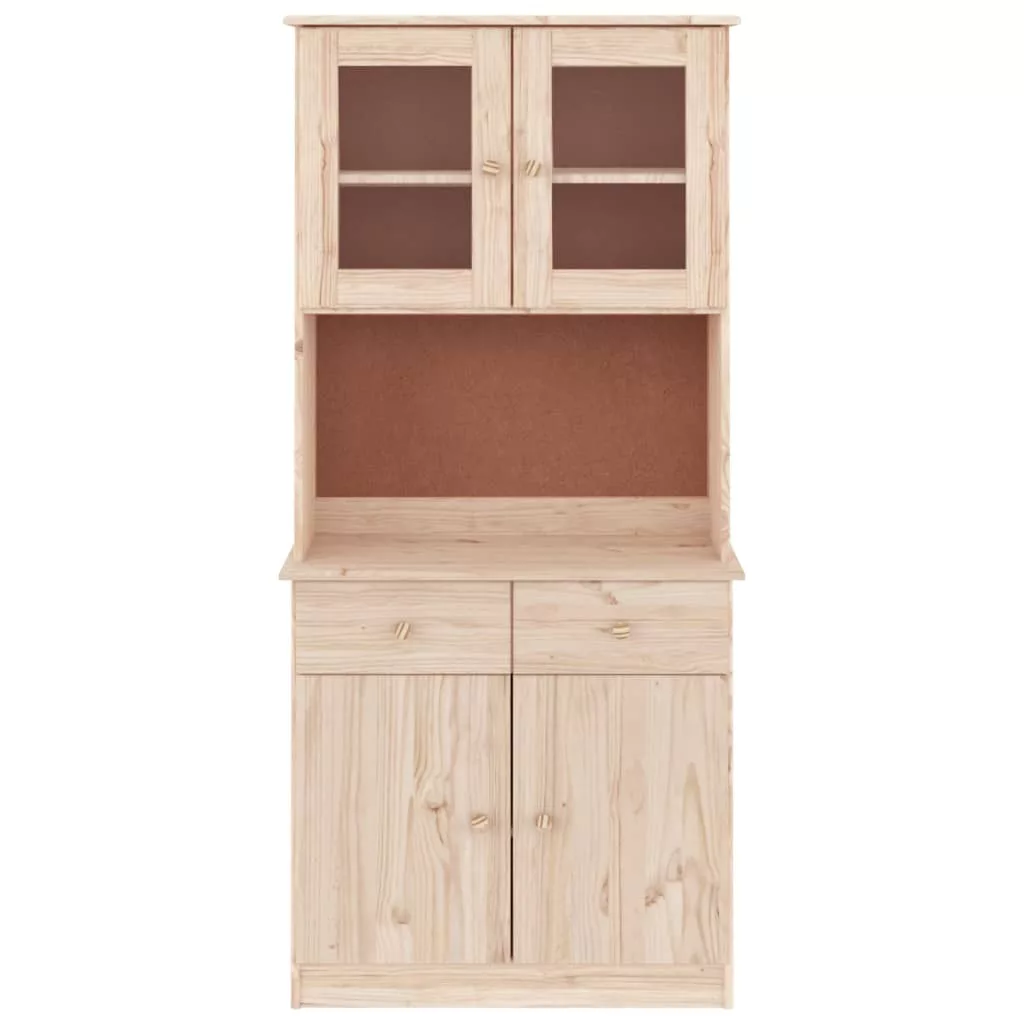 Ez a bőséges tárolóhellyel rendelkező fából készült tálalószekrény ideális kiegészítője lesz nappalijának. Tömör fenyőfa: A tömör fenyőfa egy gyönyörű természetes anyag. A fenyőfa egyenes erezetű, a csomók pedig jellegzetes, rusztikus megjelenést biztosítanak az anyagnak. A tömör fenyőfából készült szekrény strapabíró és masszív.Bőséges tárolóhely: A polcokkal, fiókokkal és üvegajtókkal rendelkező magas szekrény rengeteg tárolási és megjelenítési lehetőséget kínál kedvenc tárgyainak.Könnyen karbantartható: A tárolószekrény könnyen tisztítható nedves ruhával, és kevesebb karbantartást igényel.Fa gombok: A tálalószekrényhez fa gombfogantyúk tartoznak, amelyek megkönnyítik a szekrény kinyitását és zárását, miközben tovább növelik a szépségét.Kezeletlen felület: Mivel a szekrény tömör fenyőfából készült felületkezelés nélkül, meghagyhatja a természetes színét, de tetszés szerint festheti vagy lakkozhatja is. Figyelem:A felborulás elkerülése érdekében ezt a terméket a mellékelt fali rögzítőeszközzel kell használni.