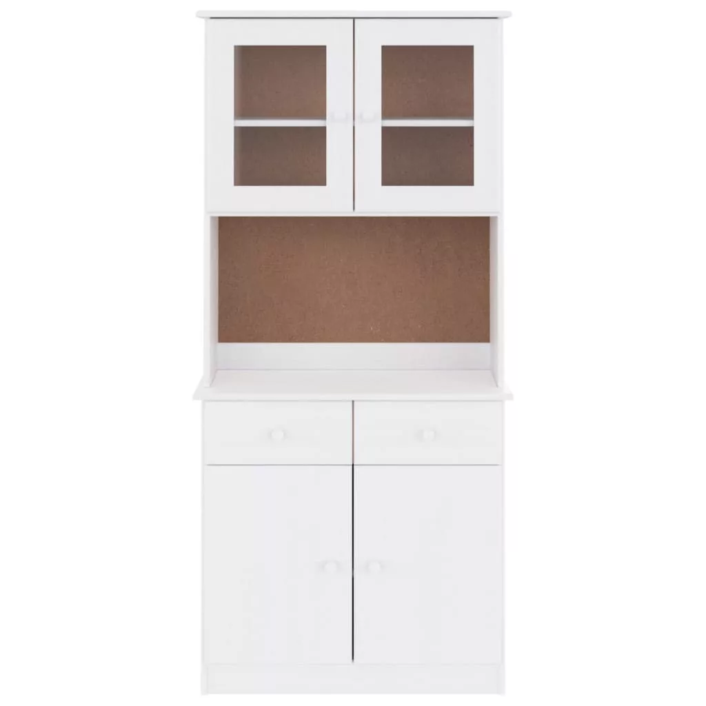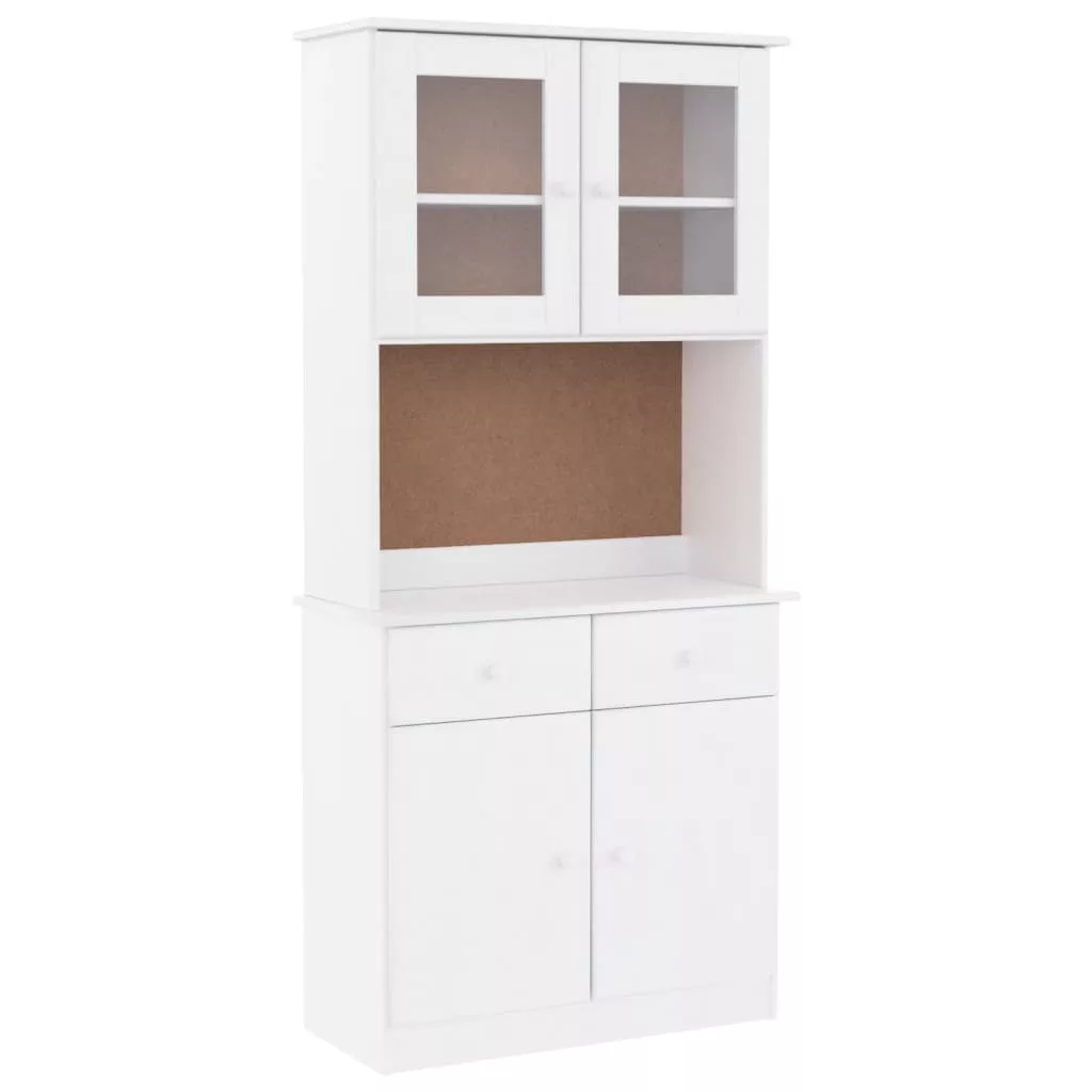 Ez a bőséges tárolóhellyel rendelkező fából készült tálalószekrény ideális kiegészítője lesz nappalijának. Tömör fenyőfa: A tömör fenyőfa egy gyönyörű természetes anyag. A fenyőfa egyenes erezetű, a csomók pedig jellegzetes, rusztikus megjelenést biztosítanak az anyagnak. A tömör fenyőfából készült szekrény strapabíró és masszív.Bőséges tárolóhely: A polcokkal, fiókokkal és üvegajtókkal rendelkező magas szekrény rengeteg tárolási és megjelenítési lehetőséget kínál kedvenc tárgyainak.Könnyen karbantartható: A tárolószekrény könnyen tisztítható nedves ruhával, és kevesebb karbantartást igényel.Fa gombok: A tálalószekrényhez fa gombfogantyúk tartoznak, amelyek megkönnyítik a szekrény kinyitását és zárását, miközben tovább növelik a szépségét. Figyelem:A felborulás elkerülése érdekében ezt a terméket a mellékelt fali rögzítőeszközzel kell használni.