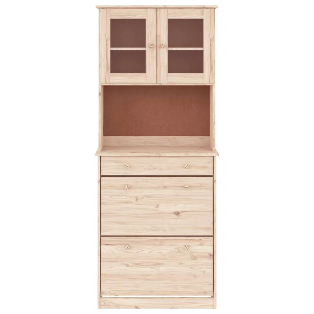 Ez a bőséges tárolóhellyel rendelkező fából készült tálalószekrény ideális kiegészítője lesz nappalijának. Tömör fenyőfa: A tömör fenyőfa egy gyönyörű természetes anyag. A fenyőfa egyenes erezetű, a csomók pedig jellegzetes, rusztikus megjelenést biztosítanak az anyagnak. A tömör fenyőfából készült szekrény strapabíró és masszív.Bőséges tárolóhely: A polcokkal, egy fiókkal és üvegajtókkal rendelkező magasszekrény rengeteg tárolási és megjelenítési lehetőséget kínál kedvenc tárgyai számára.Könnyen karbantartható: A tárolószekrény könnyen tisztítható nedves ruhával, és kevesebb karbantartást igényel.Fa gombok: A tálalószekrényhez fa gombfogantyúk tartoznak, amelyek megkönnyítik a szekrény kinyitását és zárását, miközben tovább növelik a szépségét.Kezeletlen felület: Mivel a szekrény tömör fenyőfából készült felületkezelés nélkül, meghagyhatja a természetes színét, de tetszés szerint festheti vagy lakkozhatja is. Figyelem:A felborulás elkerülése érdekében ezt a terméket a mellékelt fali rögzítőeszközzel kell használni.