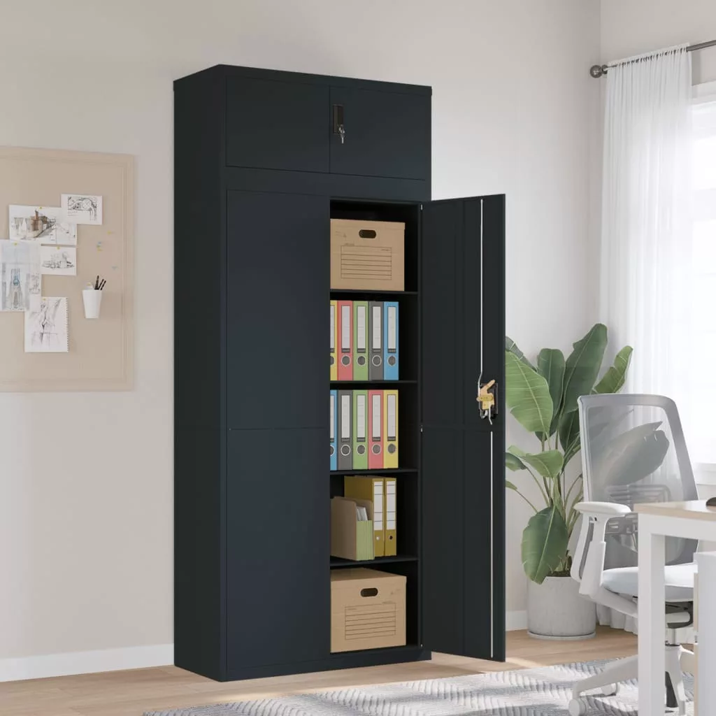 Ez az egyszerű, de stílusos dizájnnal rendelkező irattartó szekrény nagyszerű választás az akták és egyéb irodai kellékek rendezett tárolásához. Strapabíró anyag: Az acél rendkívül kemény és erős anyag. Szilárdságot és stabilitást biztosít. Az acél felületén lévő porbevonat védőréteget képez a rozsda, a korrózió és a kopás ellen. A porszórt acélból készült irattartó szekrényt tisztítani és karbantartani is könnyű.Állítható polcok: A tálalószekrény 4 állítható polccal rendelkezik, így iratait stílusosan kategóriákba rendezheti.Bőséges tárolóhely: Az irodaszekrény bőséges helyet biztosít az akták és egyéb irodai eszközök tárolására.Zárható rendszer: A zárható kialakítás garantálja az iratok és a lényeges dokumentumok biztonságát. Figyelem:A felborulás elkerülése érdekében ezt a terméket a mellékelt fali rögzítőeszközzel kell használni.