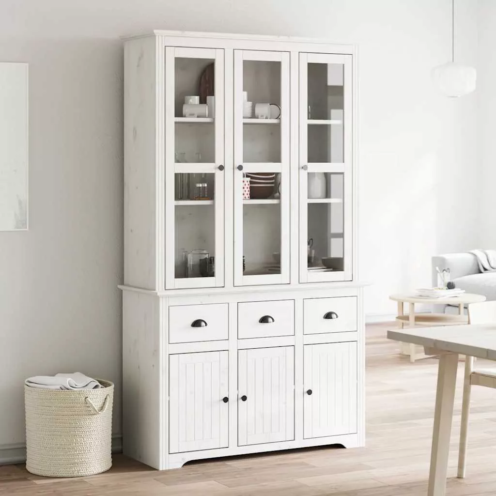Ez a francia dizájnnal rendelkező klasszikus tálalószekrény kielégíti igényeit és a helyiség kiváló kiegészítője lesz. Tömör fenyőfa: A tömör fenyőfa egy gyönyörű természetes anyag. A fenyőfa erezete egyenes, a csomók pedig jellegzetes, rusztikus megjelenést kölcsönöznek az anyagnak.Bőséges tárolóhely: A magasszekrény bőséges helyet biztosít különféle alapvető mindennapi holmijai kézközelben történő rendezett tárolásához. Az üvegajtó láthatóvá teszi a benne lévő tárgyakat.Fémfogantyúk: A tálalószekrény fémfogantyúi kényelmessé teszik az ajtók nyitását és csukását. Emellett vonzóbbá varázsolják a tárolószekrényt.Bájos francia stílus: Varázsoljon inspiráló francia stílust belső berendezésébe! Figyelem:A felborulás elkerülése érdekében ezt a terméket a mellékelt fali rögzítőeszközzel kell használni.
