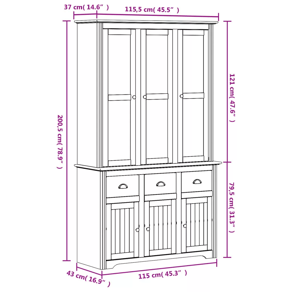 Ez a francia dizájnnal rendelkező klasszikus tálalószekrény kielégíti igényeit és a helyiség kiváló kiegészítője lesz. Tömör fenyőfa: A tömör fenyőfa egy gyönyörű természetes anyag. A fenyőfa erezete egyenes, a csomók pedig jellegzetes, rusztikus megjelenést kölcsönöznek az anyagnak.Bőséges tárolóhely: A magasszekrény bőséges helyet biztosít különféle alapvető mindennapi holmijai kézközelben történő rendezett tárolásához. Az üvegajtó láthatóvá teszi a benne lévő tárgyakat.Fémfogantyúk: A tálalószekrény fémfogantyúi kényelmessé teszik az ajtók nyitását és csukását. Emellett vonzóbbá varázsolják a tárolószekrényt.Bájos francia stílus: Varázsoljon inspiráló francia stílust belső berendezésébe! Figyelem:A felborulás elkerülése érdekében ezt a terméket a mellékelt fali rögzítőeszközzel kell használni.
