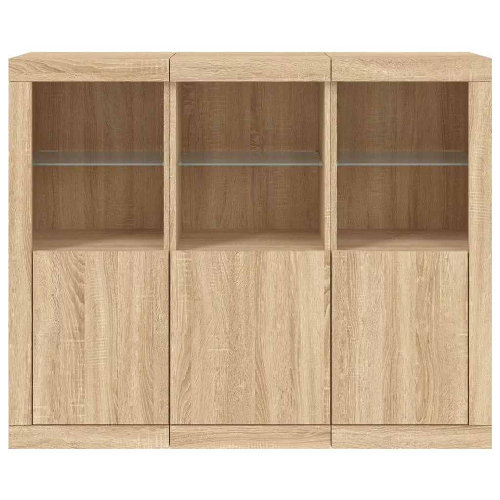 3 db sonoma tölgy színű szerelt fa tálalószekrény LED-ekkel