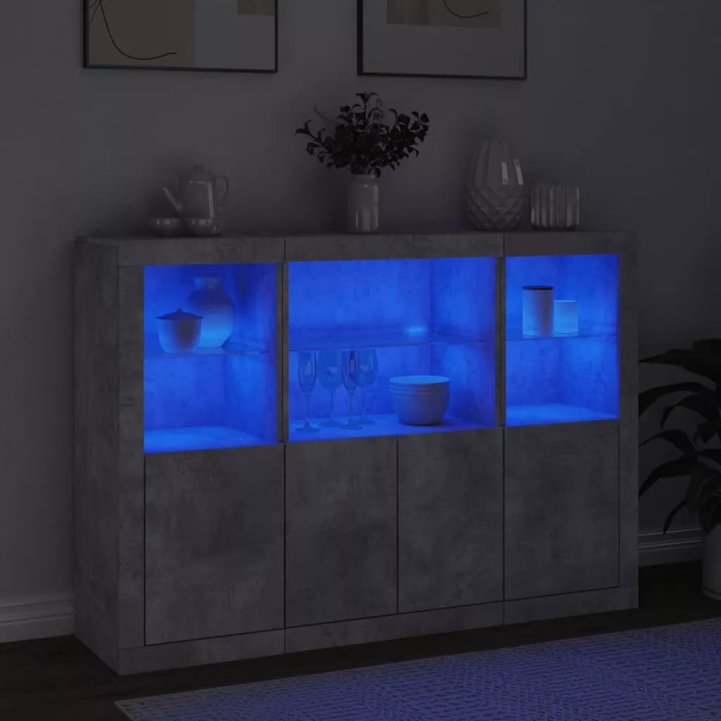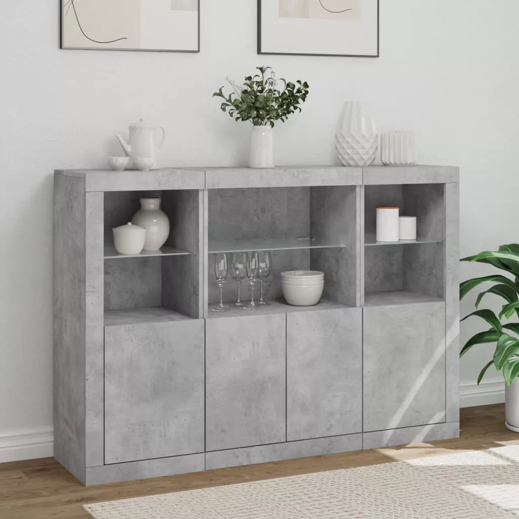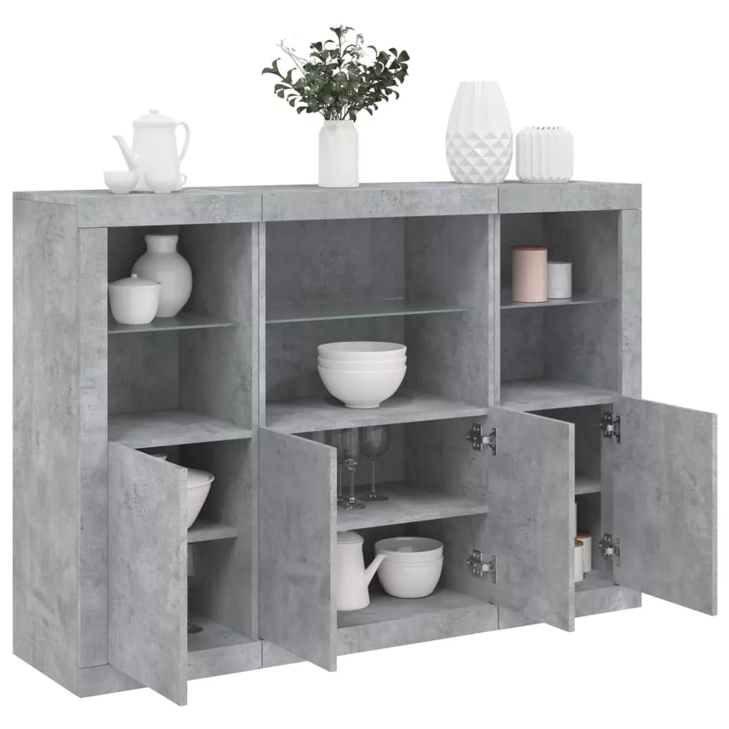 3 db betonszürke szerelt fa tálalószekrény LED-ekkel