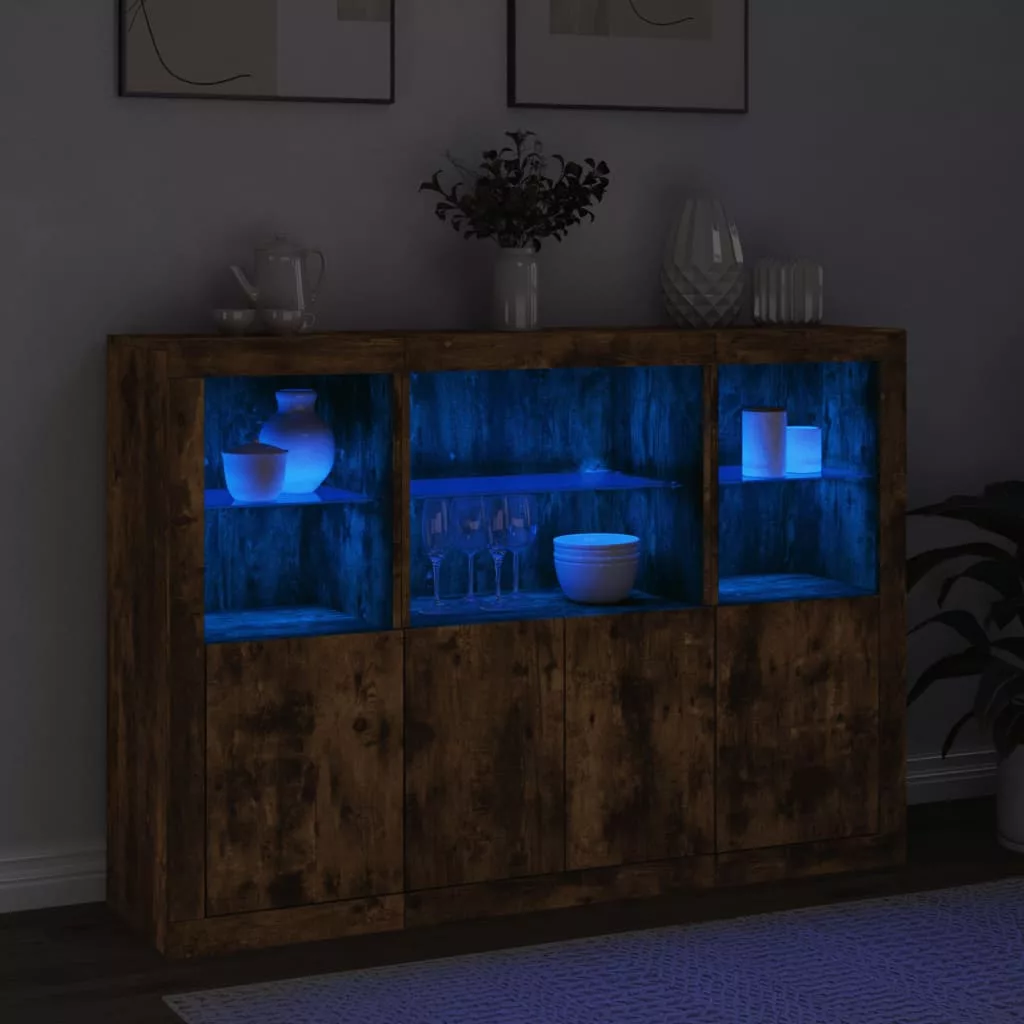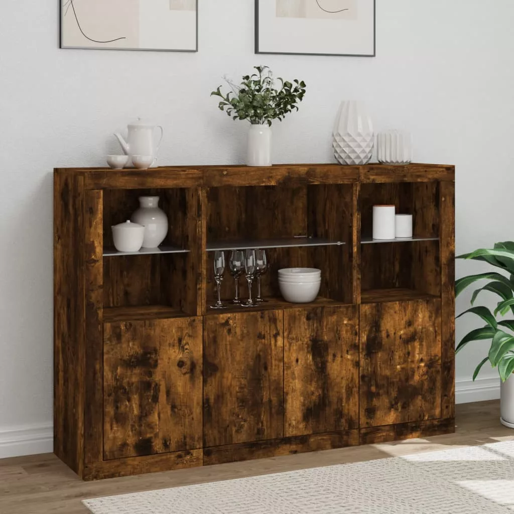 3 db füstös tölgy színű szerelt fa tálalószekrény LED-ekkel