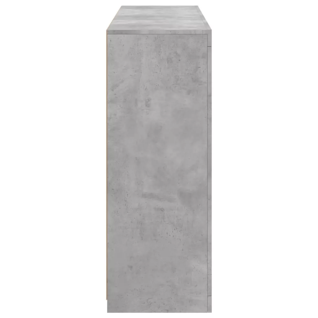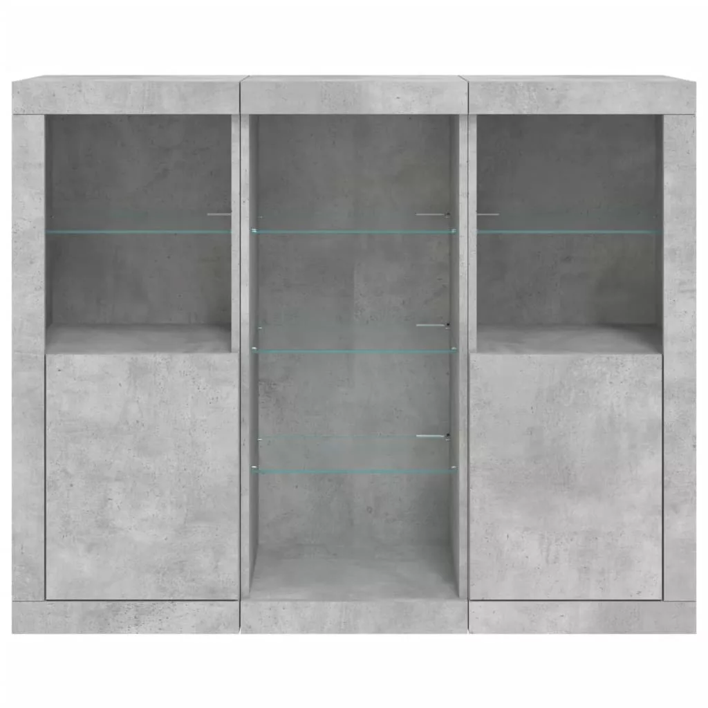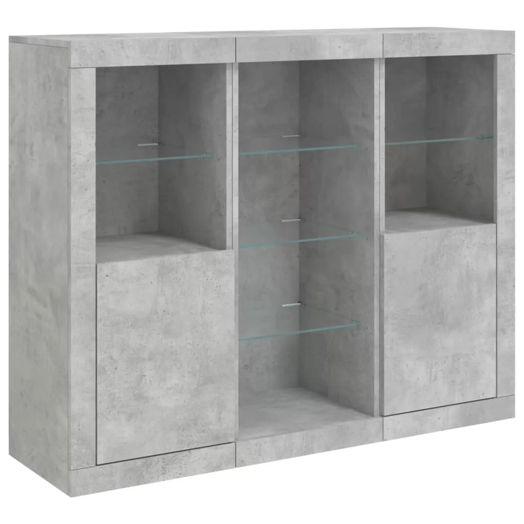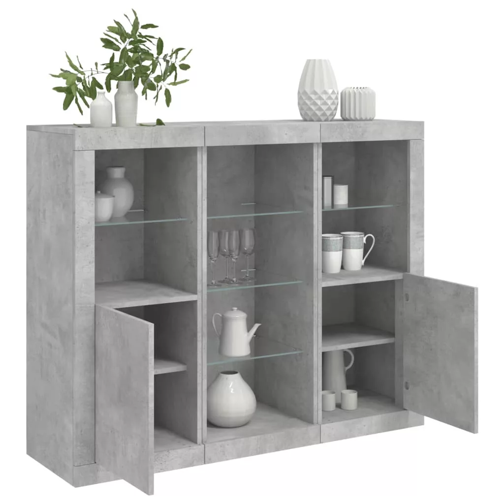 3 db betonszürke szerelt fa tálalószekrény LED-ekkel