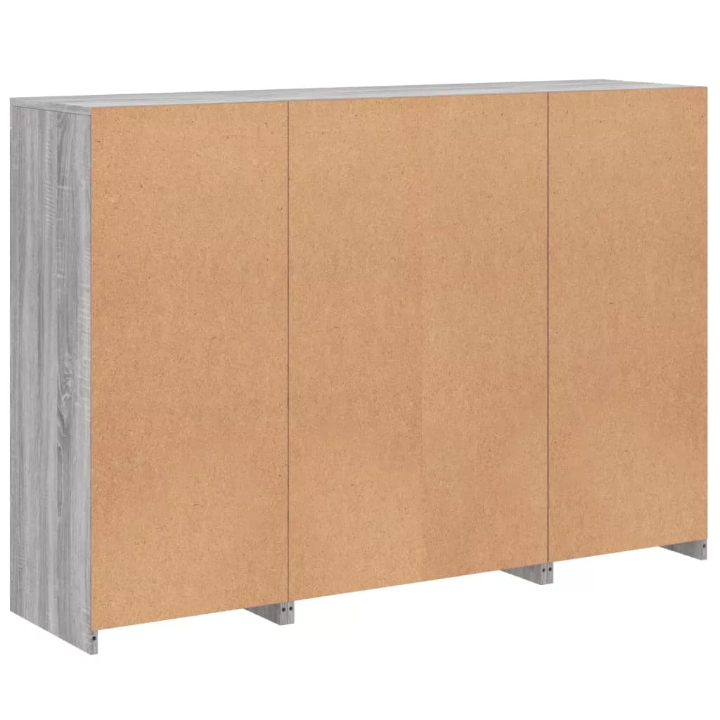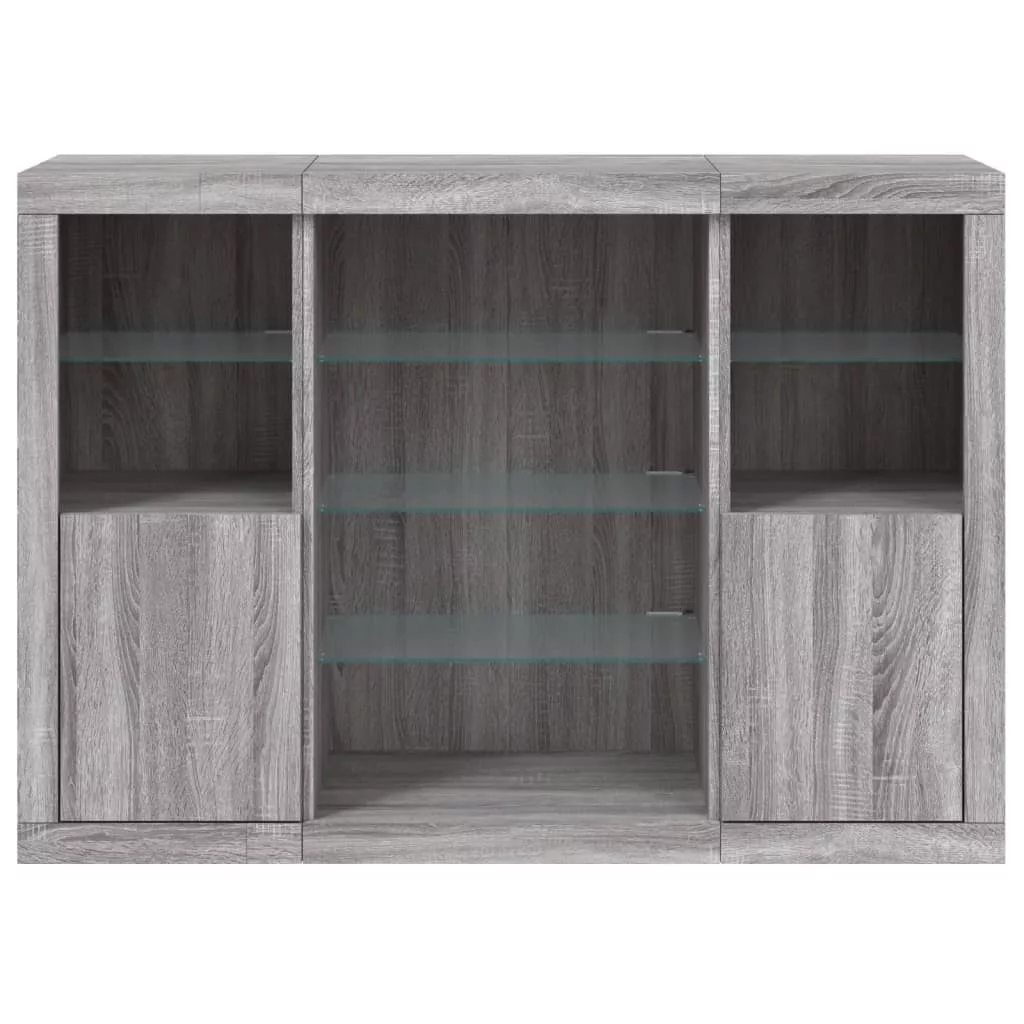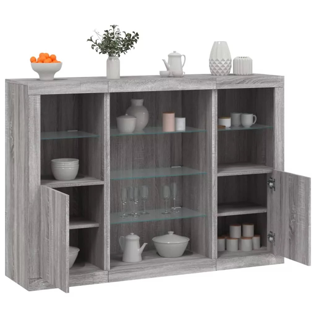 3 db szürke sonoma színű szerelt fa tálalószekrény LED-ekkel