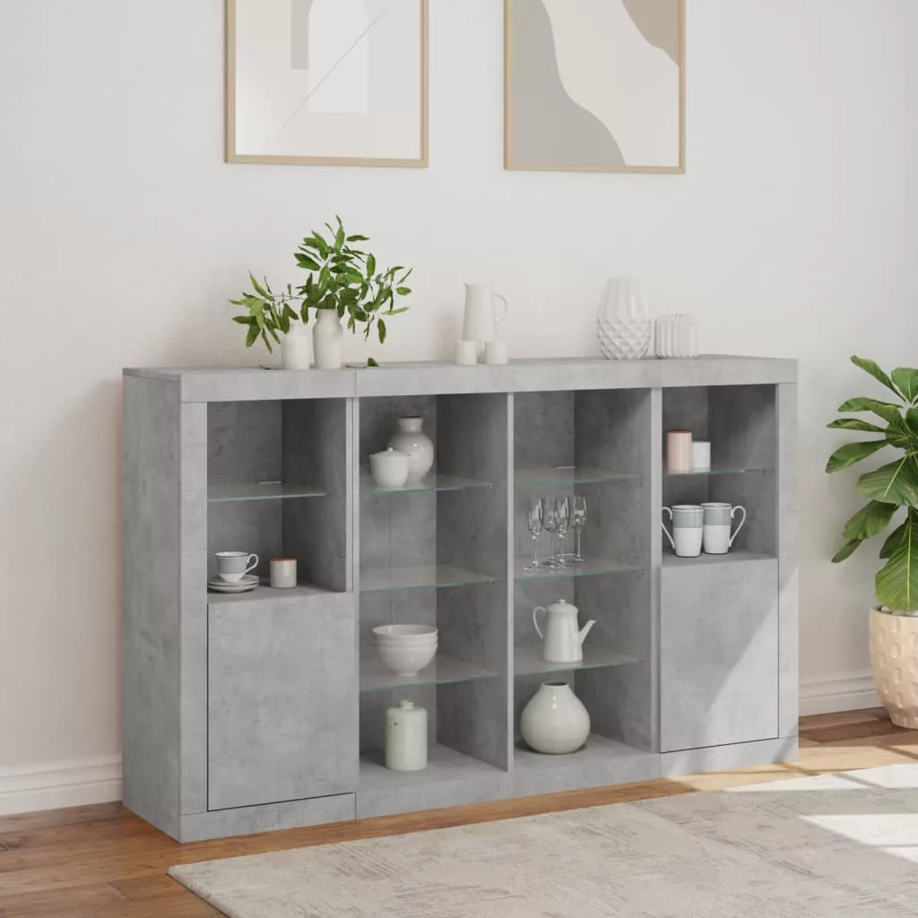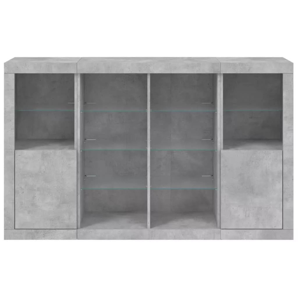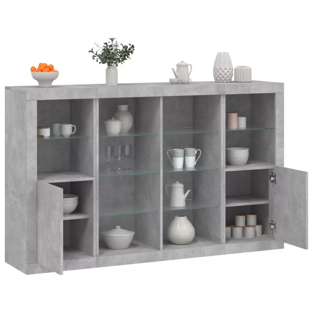 3 db betonszürke szerelt fa tálalószekrény LED-ekkel
