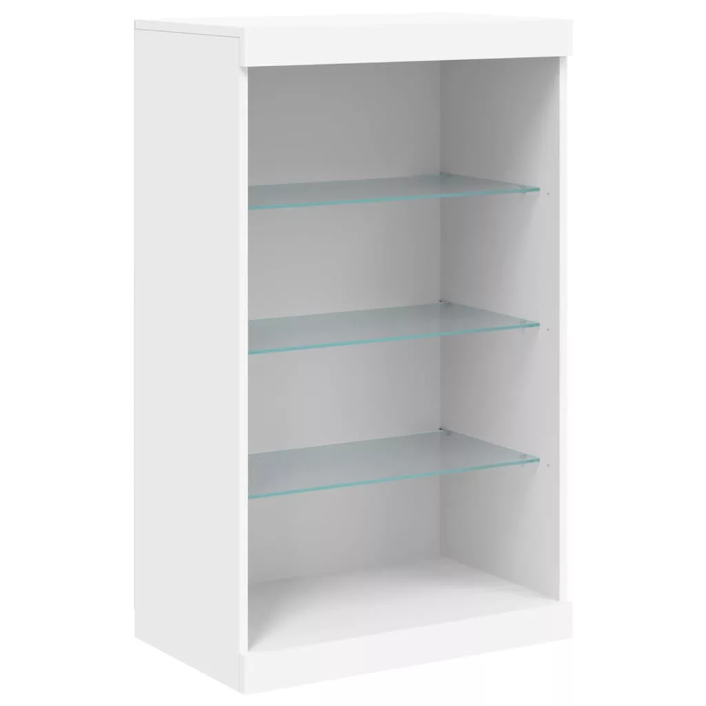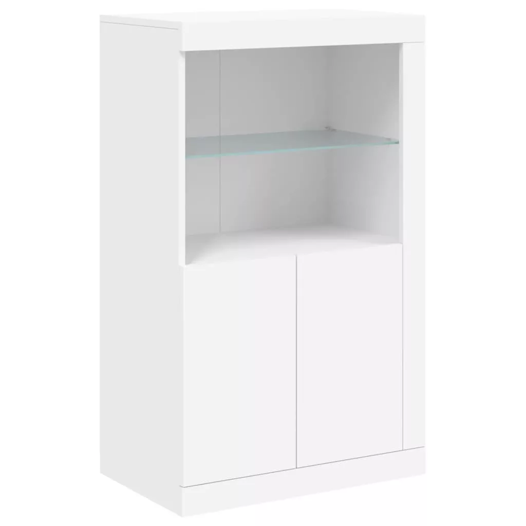 Díszítse fel szobáját ezzel a modern, LED-es lámpákkal felszerelt tálalószekrénnyel, mely könnyedén beleolvad otthona bármely stílusához. Tartós anyag: A szerelt fa kivételes minőségű, sima felületű, szilárd, stabil, és ellenáll a nedvességnek.RGB LED-világítás: A tálalószekrény élénk RGB LED-világítással lett felszerelve. A sokféle testre szabható menü segítségével egyszerűen megváltoztathatja a világítás színét, sőt, automatikus váltakozást is beállíthat. Ezek a LED-lámpák nemcsak a tálalószekrény modern megjelenését, de divatosságát is növelik.Bőséges tárolóhely: A tárolószekrény rengeteg helyet kínál mindennapi tárgyainak rendezett és könnyen elérhető tárolására.Bemutatófunkció: Az előszobaszekrény masszív lapja ideális dísztárgyak, képkeretek és cserepes növények elhelyezésére.Praktikus ajtók: Tartsa pormentesen legfontosabb dolgait a kisszekrény ajtajai mögé rejtve őket. Jó tudni:A termék USB-csatlakozóval rendelkezik, amelyhez hitelesített, 5 V-os USB áramforrás szükséges (nem alaptartozék). Figyelem:A felborulás elkerülése érdekében ezt a terméket a mellékelt fali rögzítőeszközzel kell használni. Ne használja ezt az elemet, ha valamelyik alkatrésze eltört, elszakadt vagy hiányzik. Ez a termék DC 5V-ról működik, de a tanúsított 5V-os USB-tápforrást nem tartalmazza. A magasabb feszültség túlmelegedést okozhat, és a készülék károsodását, valamint a túlmelegedés és a tűz lehetséges kockázatát okozhatja.