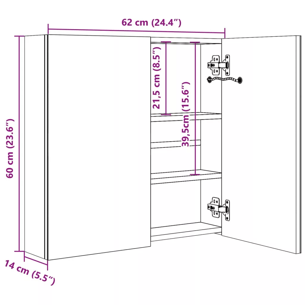 Csempésszen különleges bájt fürdőszobájába LED-es tükrös szekrényünkkel! A LED-fényekkel ellátott fali tükrös szekrényünk egy csipetnyi modern stílust és lágy világítást visz minden helyiségbe! Melamin bevonatú minőségi MDF lemezből készült, garantálva a hosszú távú használatot. A két energiatakarékos LED-es fénycsíknak köszönhetően a legmegfelelőbb fényben láthatja magát sminkeléshez, arc- és bőrápoláshoz, és nem csak a szoba szépül meg, de arca és mosolya is. Három polca bőséges helyet biztosít piperecikkei és kozmetikai kiegészítői tárolására. Az alsó gombbal egyszerű be- és kikapcsolni a világítást. A stílusos és praktikus szekrény biztosan különlegessé teszi szobáját! A szekrény könnyen felszerelhető a falra. Megjegyzés:A termék USB-csatlakozóval rendelkezik, ám a hitelesített 5 V-os USB áramforrást a csomag nem tartalmazza. Kérjük, vegye figyelembe, hogy csak tanúsított DC 5V bemenetet használjon. A magasabb feszültség túlmelegedést okozhat, és a készülék károsodását, valamint a túlmelegedés és a tűz lehetséges kockázatát okozhatja.