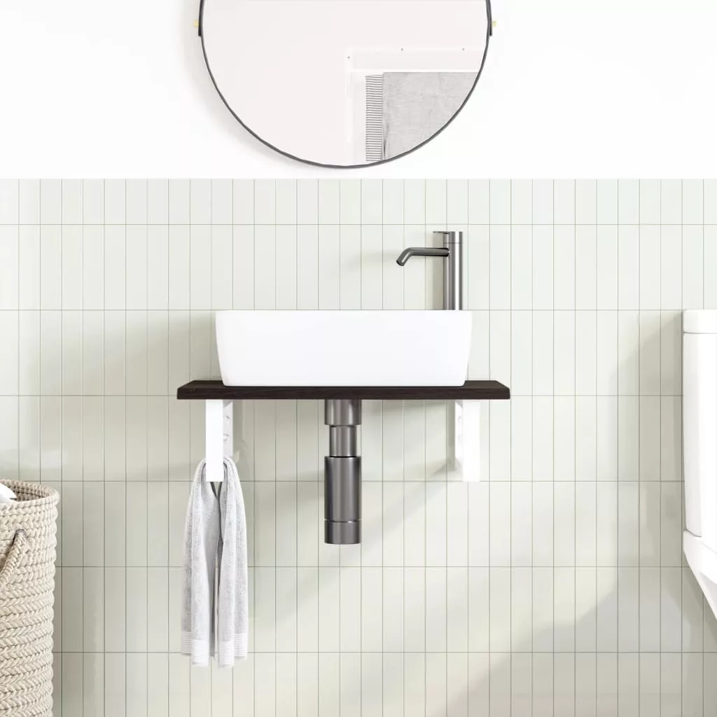 A falra szerelhető mosdópolc biztonságosan a falhoz rögzíthető, elegáns és helytakarékos megoldást nyújtva fürdőszobájának. Erős és tartós: Ez a mosdópolc acélszerkezettel és tömör tölgyfa lappal lett ellátva, így erős, stabil és hosszú élettartamú.Helytakarékos: A lebegő mosdókagylópolcon bőséges hely van krémek és apróbb tárgyak tárolására. A téglalap alakú formának köszönhetően törölközőket vagy egyéb dolgokat akaszthat a tartóra, hogy helyet takarítson meg.Könnyen használható: A munkalap fúratlan, így a mosdó balra, jobbra vagy középre szerelhető, a helyiség igényeitől függően. A tartóba előre fúrt furatoknak köszönhetően könnyen összeszerelhető az asztallappal és a falra szerelhető.Széleskörű felhasználási terület: Modern kialakításának köszönhetően további helyet biztosít különféle típusú fürdőszobáknak. Jó tudni:A csavarokat nem tartalmazza, a csavarokat megvásárolhatja külön az alábbi információk alapján.Fali rögzítés: konzolonként 2 db M8 feszítőcsavarFa lap: 2 db M5x18 csavar (T=2) vagy 2 db M5x20 csavar (T=2,5/4cm) konzolonkéntMivel ez egy természetes termék, a fán előfordulhatnak csomók és tökéletlenségek, amelyeket fekete töltettel töltünk ki a sima megjelenés érdekében.