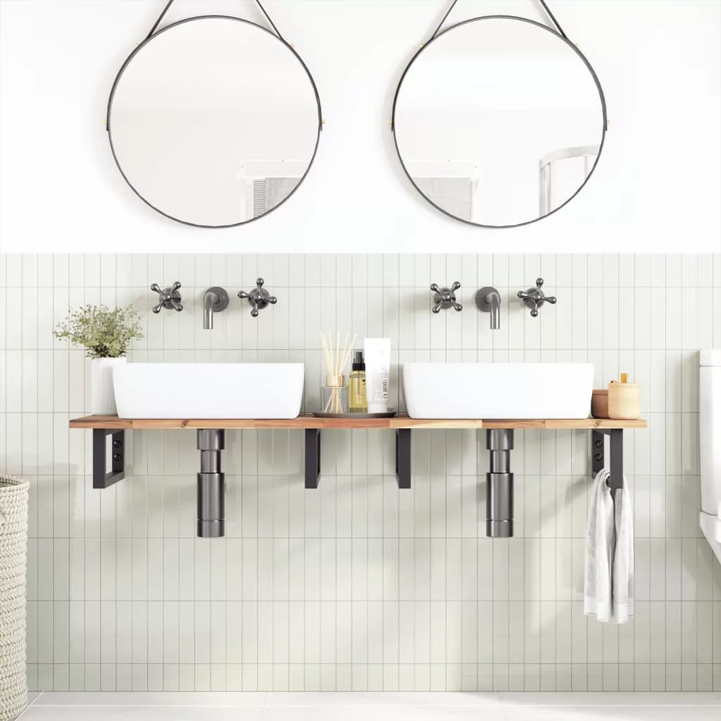 A falra szerelhető mosdópolc biztonságosan a falhoz rögzíthető, elegáns és helytakarékos megoldást nyújtva fürdőszobájának. Erős és tartós: Ez a mosdópolc acélszerkezettel és tömör akácfa lappal lett ellátva, így erős, stabil és hosszú élettartamú.Helytakarékos: A lebegő mosdókagylópolcon bőséges hely van krémek és apróbb tárgyak tárolására. A téglalap alakú formának köszönhetően törölközőket vagy egyéb dolgokat akaszthat a tartóra, hogy helyet takarítson meg.Könnyen használható: A munkalap fúratlan, így a mosdó balra, jobbra vagy középre szerelhető, a helyiség igényeitől függően. A tartóba előre fúrt furatoknak köszönhetően könnyen összeszerelhető az asztallappal és a falra szerelhető.Széleskörű felhasználási terület: Modern kialakításának köszönhetően további helyet biztosít különféle típusú fürdőszobáknak. Jó tudni:A csavarokat nem tartalmazza, a csavarokat megvásárolhatja külön az alábbi információk alapján.Fali rögzítés: konzolonként 2 db M8 feszítőcsavarFa lap: 2 db M5x18 csavar (T=2) vagy 2 db M5x20 csavar (T=2,5/4cm) konzolonként