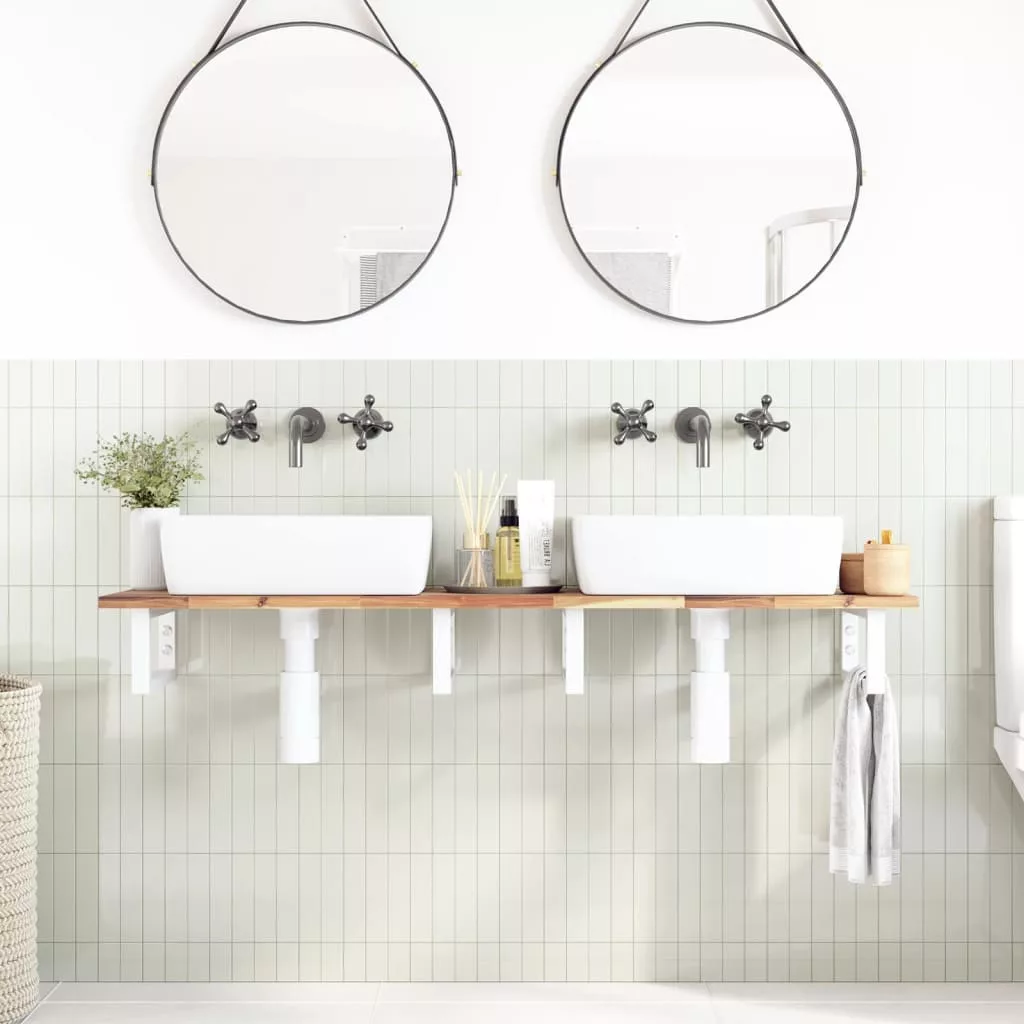 A falra szerelhető mosdópolc biztonságosan a falhoz rögzíthető, elegáns és helytakarékos megoldást nyújtva fürdőszobájának. Erős és tartós: Ez a mosdópolc acélszerkezettel és tömör akácfa lappal lett ellátva, így erős, stabil és hosszú élettartamú.Helytakarékos: A lebegő mosdókagylópolcon bőséges hely van krémek és apróbb tárgyak tárolására. A téglalap alakú formának köszönhetően törölközőket vagy egyéb dolgokat akaszthat a tartóra, hogy helyet takarítson meg.Könnyen használható: A munkalap fúratlan, így a mosdó balra, jobbra vagy középre szerelhető, a helyiség igényeitől függően. A tartóba előre fúrt furatoknak köszönhetően könnyen összeszerelhető az asztallappal és a falra szerelhető.Széleskörű felhasználási terület: Modern kialakításának köszönhetően további helyet biztosít különféle típusú fürdőszobáknak. Jó tudni:A csavarokat nem tartalmazza, a csavarokat megvásárolhatja külön az alábbi információk alapján.Fali rögzítés: konzolonként 2 db M8 feszítőcsavarFa lap: 2 db M5x18 csavar (T=2) vagy 2 db M5x20 csavar (T=2,5/4cm) konzolonként