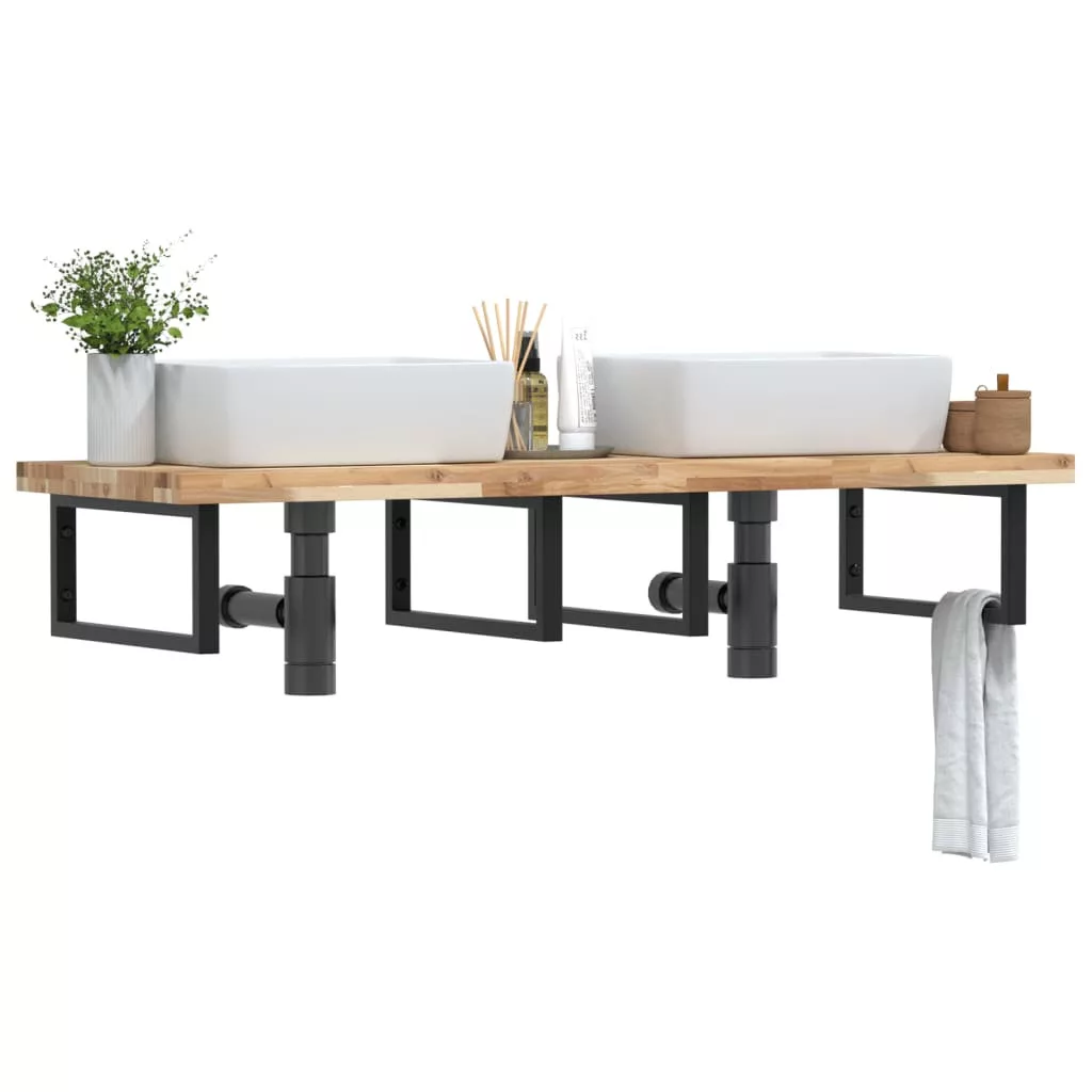 A falra szerelhető mosdópolc biztonságosan a falhoz rögzíthető, elegáns és helytakarékos megoldást nyújtva fürdőszobájának. Erős és tartós: Ez a mosdópolc acélszerkezettel és tömör akácfa lappal lett ellátva, így erős, stabil és hosszú élettartamú.Helytakarékos: A lebegő mosdókagylópolcon bőséges hely van krémek és apróbb tárgyak tárolására. A téglalap alakú formának köszönhetően törölközőket vagy egyéb dolgokat akaszthat a tartóra, hogy helyet takarítson meg.Könnyen használható: A munkalap fúratlan, így a mosdó balra, jobbra vagy középre szerelhető, a helyiség igényeitől függően. A tartóba előre fúrt furatoknak köszönhetően könnyen összeszerelhető az asztallappal és a falra szerelhető.Széleskörű felhasználási terület: Modern kialakításának köszönhetően további helyet biztosít különféle típusú fürdőszobáknak. Jó tudni:A csavarokat nem tartalmazza, a csavarokat megvásárolhatja külön az alábbi információk alapján.Fali rögzítés: konzolonként 2 db M8 feszítőcsavarFa lap: 2 db M5x18 csavar (T=2) vagy 2 db M5x20 csavar (T=2,5/4cm) konzolonként