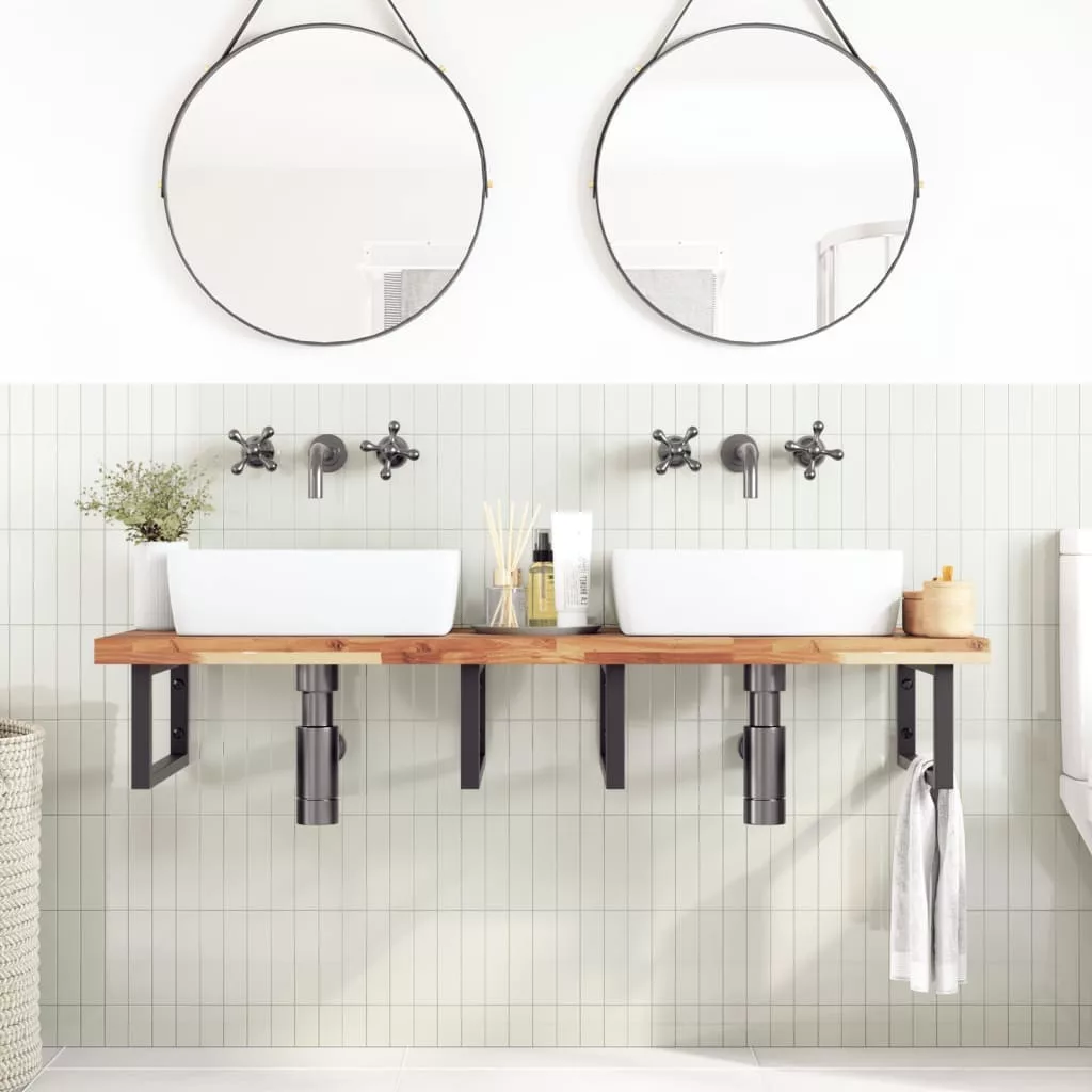 A falra szerelhető mosdópolc biztonságosan a falhoz rögzíthető, elegáns és helytakarékos megoldást nyújtva fürdőszobájának. Erős és tartós: Ez a mosdópolc acélszerkezettel és tömör akácfa lappal lett ellátva, így erős, stabil és hosszú élettartamú.Helytakarékos: A lebegő mosdókagylópolcon bőséges hely van krémek és apróbb tárgyak tárolására. A téglalap alakú formának köszönhetően törölközőket vagy egyéb dolgokat akaszthat a tartóra, hogy helyet takarítson meg.Könnyen használható: A munkalap fúratlan, így a mosdó balra, jobbra vagy középre szerelhető, a helyiség igényeitől függően. A tartóba előre fúrt furatoknak köszönhetően könnyen összeszerelhető az asztallappal és a falra szerelhető.Széleskörű felhasználási terület: Modern kialakításának köszönhetően további helyet biztosít különféle típusú fürdőszobáknak. Jó tudni:A csavarokat nem tartalmazza, a csavarokat megvásárolhatja külön az alábbi információk alapján.Fali rögzítés: konzolonként 2 db M8 feszítőcsavarFa lap: 2 db M5x18 csavar (T=2) vagy 2 db M5x20 csavar (T=2,5/4cm) konzolonként