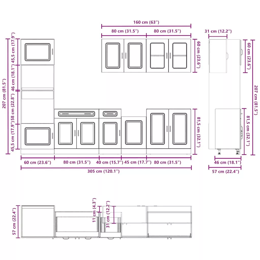Ez az elegáns kialakítású, hétrészes konyhai szekrénygarnitúra optimalizálja konyhája terét, és bőséges tárolóhelyet biztosít személyes tárgyainak! Stabil és tartós anyag: A szerelt fa tartós és stabil anyag sima felülettel, amely ellenáll a nedvességnek, a vetemedésnek és a hasadásnak, így megbízható választás különféle célokhoz.Bőséges tárolóhely: A konyhaszekrénykészlet számos rekesszel rendelkezik, és elegendő helyet kínál tálak, tányérok, edények és egyéb konyhai eszközök tárolására.Állítható lábak: Az alsó szekrények állítható lábakkal rendelkeznek, amelyek magassága a konyha elrendezésének megfelelően állítható.Könnyen karbantartható: A sima felületnek köszönhetően ezek a konyhaszekrények könnyen tisztíthatók nedves ruhával, és kevesebb karbantartást igényelnek. Figyelem:A felborulás elkerülése érdekében ezt a terméket a mellékelt fali rögzítőeszközzel kell használni. Jó tudni:A falon belüli csavar(ok) és dugó(k) nem alaptartozékok. Keressen és használjon a falának megfelelő csavar(oka)t és dugó(ka)t. Ha bizonytalan, kérje szakember tanácsát. Gondosan olvassa el és kövesse a használati utasítás minden lépését.A munkalap, a mosogató és a csaptelep nem tartozéka a szállításnak.