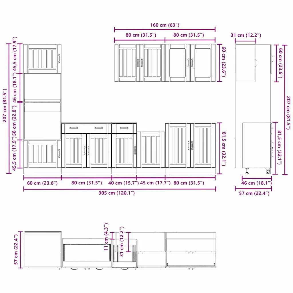 • 1 x konyhaszekrény: 60 x 57 x 207 cm (Sz x M x K)
