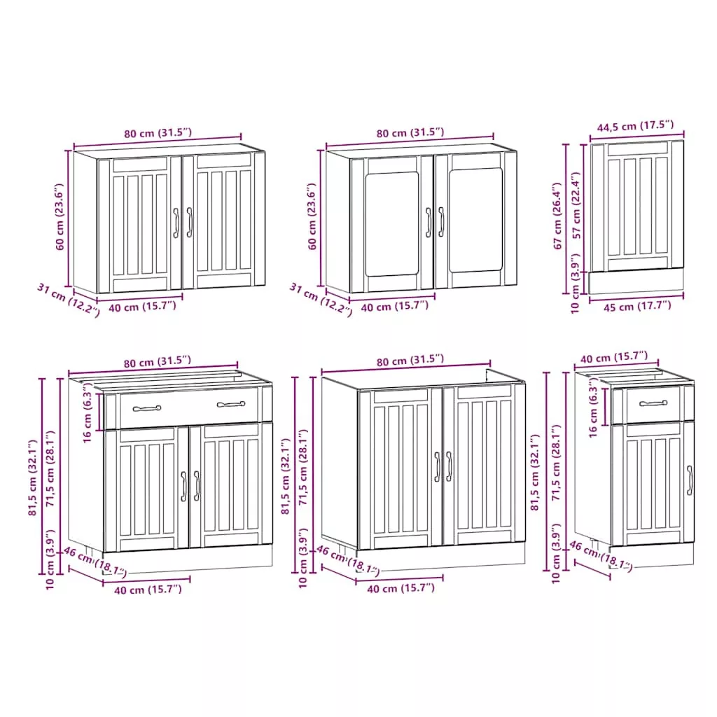 Ez az elegáns kialakítású, hétrészes konyhai szekrénygarnitúra optimalizálja konyhája terét, és bőséges tárolóhelyet biztosít személyes tárgyainak! Stabil és tartós anyag: A szerelt fa tartós és stabil anyag sima felülettel, amely ellenáll a nedvességnek, a vetemedésnek és a hasadásnak, így megbízható választás különféle célokhoz.Bőséges tárolóhely: A konyhaszekrénykészlet számos rekesszel rendelkezik, és elegendő helyet kínál tálak, tányérok, edények és egyéb konyhai eszközök tárolására.Állítható lábak: Az alsó szekrények állítható lábakkal rendelkeznek, amelyek magassága a konyha elrendezésének megfelelően állítható.Könnyen karbantartható: A sima felületnek köszönhetően ezek a konyhaszekrények könnyen tisztíthatók nedves ruhával, és kevesebb karbantartást igényelnek. Figyelem:A felborulás elkerülése érdekében ezt a terméket a mellékelt fali rögzítőeszközzel kell használni. Jó tudni:A falon belüli csavar(ok) és dugó(k) nem alaptartozékok. Keressen és használjon a falának megfelelő csavar(oka)t és dugó(ka)t. Ha bizonytalan, kérje szakember tanácsát. Gondosan olvassa el és kövesse a használati utasítás minden lépését.A munkalap, a mosogató és a csaptelep nem tartozéka a szállításnak.