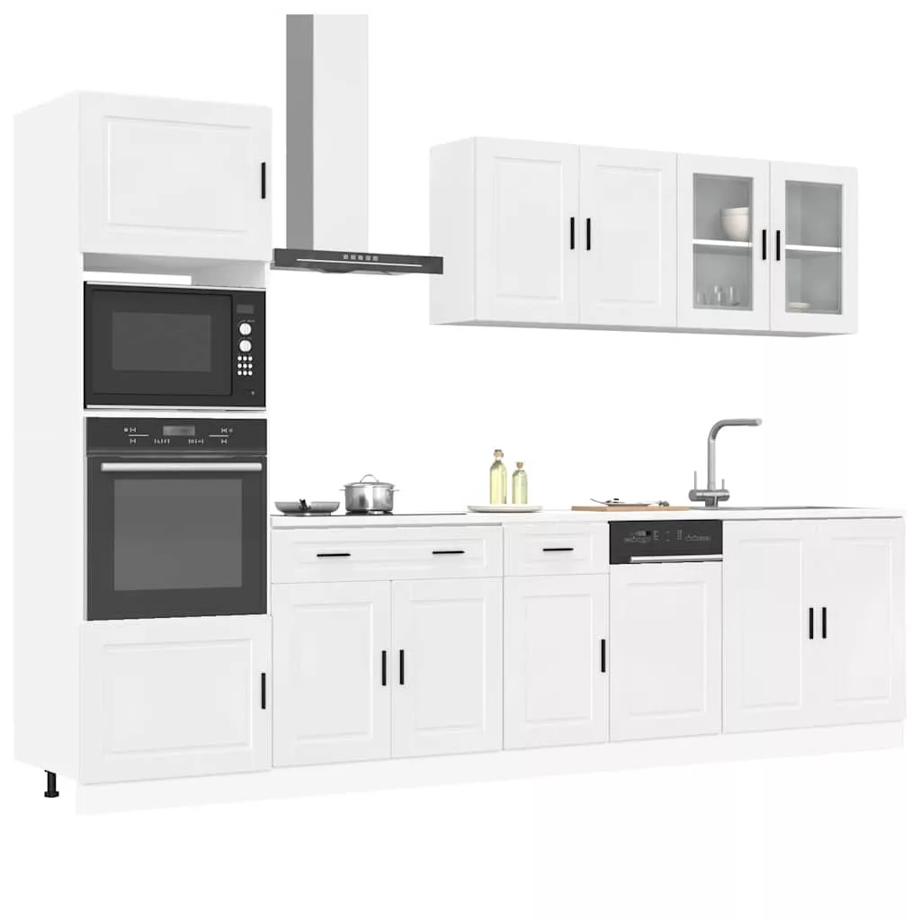 Ez az elegáns kialakítású, hétrészes konyhai szekrénygarnitúra optimalizálja konyhája terét, és bőséges tárolóhelyet biztosít személyes tárgyainak! Stabil és tartós anyag: A szerelt fa tartós és stabil anyag sima felülettel, amely ellenáll a nedvességnek, a vetemedésnek és a hasadásnak, így megbízható választás különféle célokhoz.Bőséges tárolóhely: A konyhaszekrénykészlet számos rekesszel rendelkezik, és elegendő helyet kínál tálak, tányérok, edények és egyéb konyhai eszközök tárolására.Állítható lábak: Az alsó szekrények állítható lábakkal rendelkeznek, amelyek magassága a konyha elrendezésének megfelelően állítható.Könnyen karbantartható: A sima felületnek köszönhetően ezek a konyhaszekrények könnyen tisztíthatók nedves ruhával, és kevesebb karbantartást igényelnek. Figyelem:A felborulás elkerülése érdekében ezt a terméket a mellékelt fali rögzítőeszközzel kell használni. Jó tudni:A falon belüli csavar(ok) és dugó(k) nem alaptartozékok. Keressen és használjon a falának megfelelő csavar(oka)t és dugó(ka)t. Ha bizonytalan, kérje szakember tanácsát. Gondosan olvassa el és kövesse a használati utasítás minden lépését.A munkalap, a mosogató és a csaptelep nem tartozéka a szállításnak.