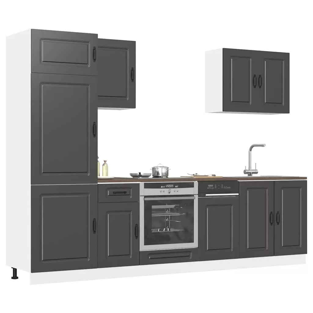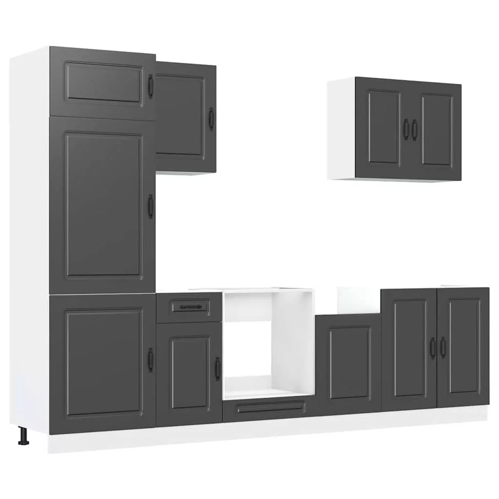 Ez az elegáns kialakítású, hétrészes konyhai szekrénygarnitúra optimalizálja konyhája terét, és bőséges tárolóhelyet biztosít személyes tárgyainak! Stabil és tartós anyag: A szerelt fa tartós és stabil anyag sima felülettel, amely ellenáll a nedvességnek, a vetemedésnek és a hasadásnak, így megbízható választás különféle célokhoz.Bőséges tárolóhely: A konyhaszekrénykészlet számos rekesszel rendelkezik, és elegendő helyet kínál tálak, tányérok, edények és egyéb konyhai eszközök tárolására.Állítható lábak: Az alsó szekrények állítható lábakkal rendelkeznek, amelyek magassága a konyha elrendezésének megfelelően állítható.Könnyen karbantartható: A sima felületnek köszönhetően ezek a konyhaszekrények könnyen tisztíthatók nedves ruhával, és kevesebb karbantartást igényelnek. Figyelem:A felborulás elkerülése érdekében ezt a terméket a mellékelt fali rögzítőeszközzel kell használni. Jó tudni:A falon belüli csavar(ok) és dugó(k) nem alaptartozékok. Keressen és használjon a falának megfelelő csavar(oka)t és dugó(ka)t. Ha bizonytalan, kérje szakember tanácsát. Gondosan olvassa el és kövesse a használati utasítás minden lépését.A munkalap, a mosogató és a csaptelep nem tartozéka a szállításnak.