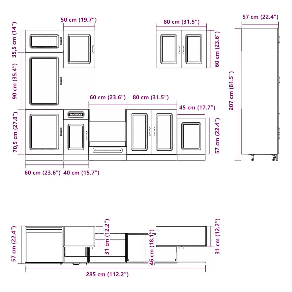 • 1 x konyhaszekrény: 60 x 57 x 207 cm (Sz x M x K)