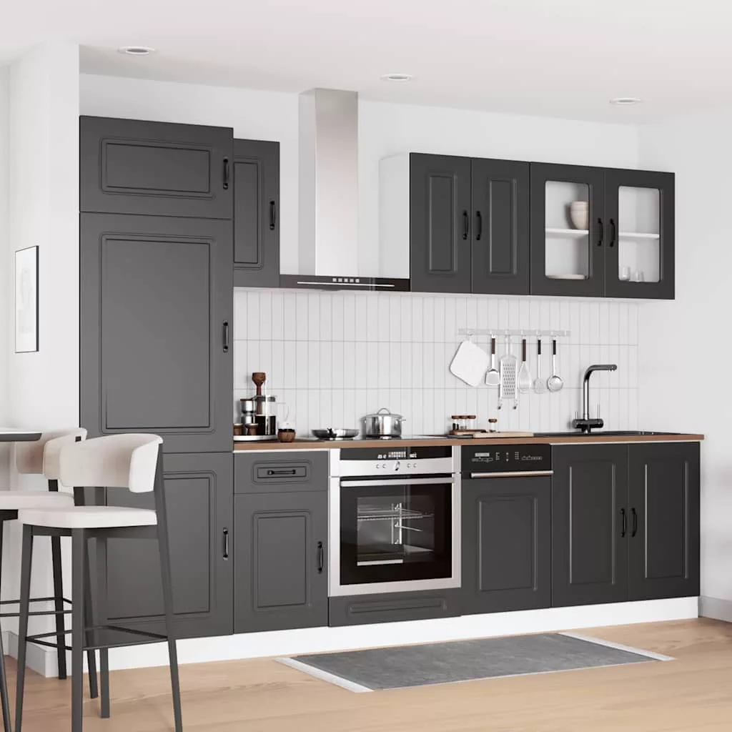 Ez az elegáns kialakítású, nyolcrészes konyhai szekrénygarnitúra optimalizálja konyhája terét, és bőséges tárolóhelyet biztosít személyes tárgyainak! Stabil és tartós anyag: A szerelt fa tartós és stabil anyag sima felülettel, amely ellenáll a nedvességnek, a vetemedésnek és a hasadásnak, így megbízható választás különféle célokhoz.Bőséges tárolóhely: A konyhaszekrénykészlet számos rekesszel rendelkezik, és elegendő helyet kínál tálak, tányérok, edények és egyéb konyhai eszközök tárolására.Állítható lábak: Az alsó szekrények állítható lábakkal rendelkeznek, amelyek magassága a konyha elrendezésének megfelelően állítható.Könnyen karbantartható: A sima felületnek köszönhetően ezek a konyhaszekrények könnyen tisztíthatók nedves ruhával, és kevesebb karbantartást igényelnek. Figyelem:A felborulás elkerülése érdekében ezt a terméket a mellékelt fali rögzítőeszközzel kell használni. Jó tudni:A falon belüli csavar(ok) és dugó(k) nem alaptartozékok. Keressen és használjon a falának megfelelő csavar(oka)t és dugó(ka)t. Ha bizonytalan, kérje szakember tanácsát. Gondosan olvassa el és kövesse a használati utasítás minden lépését.A munkalap, a mosogató és a csaptelep nem tartozéka a szállításnak.