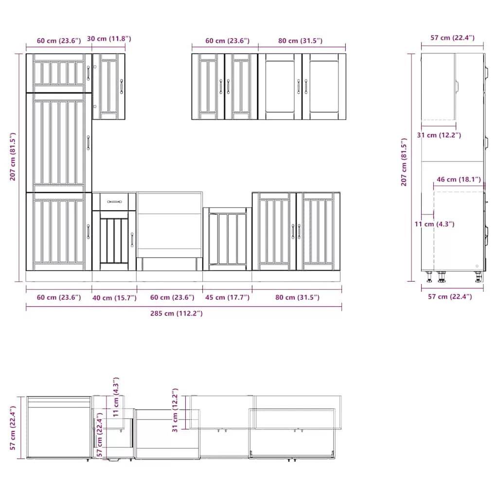 • 1 x konyhaszekrény: 60 x 57 x 207 cm (Sz x M x K)
