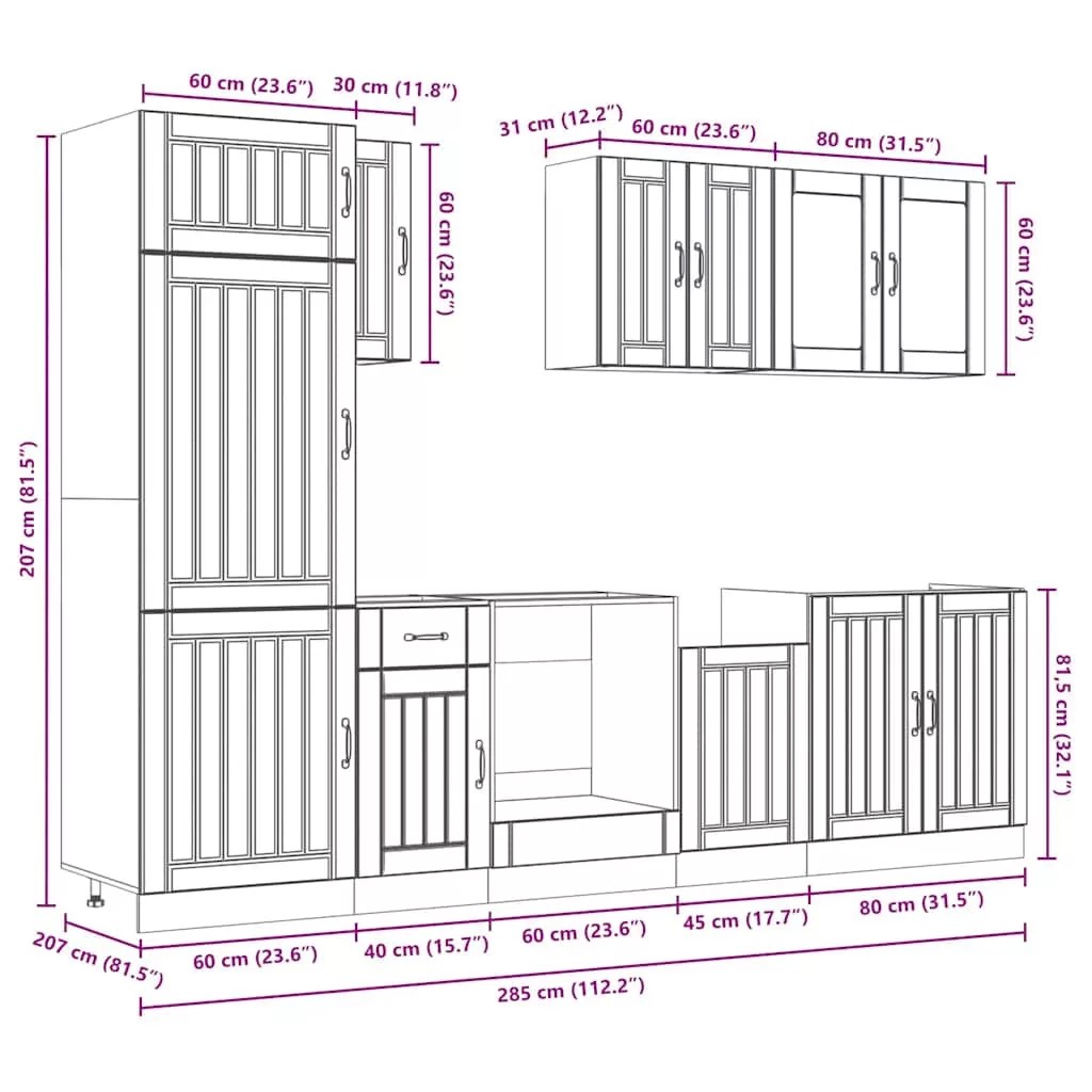 Ez az elegáns kialakítású, nyolcrészes konyhai szekrénygarnitúra optimalizálja konyhája terét, és bőséges tárolóhelyet biztosít személyes tárgyainak! Stabil és tartós anyag: A szerelt fa tartós és stabil anyag sima felülettel, amely ellenáll a nedvességnek, a vetemedésnek és a hasadásnak, így megbízható választás különféle célokhoz.Bőséges tárolóhely: A konyhaszekrénykészlet számos rekesszel rendelkezik, és elegendő helyet kínál tálak, tányérok, edények és egyéb konyhai eszközök tárolására.Állítható lábak: Az alsó szekrények állítható lábakkal rendelkeznek, amelyek magassága a konyha elrendezésének megfelelően állítható.Könnyen karbantartható: A sima felületnek köszönhetően ezek a konyhaszekrények könnyen tisztíthatók nedves ruhával, és kevesebb karbantartást igényelnek. Figyelem:A felborulás elkerülése érdekében ezt a terméket a mellékelt fali rögzítőeszközzel kell használni. Jó tudni:A falon belüli csavar(ok) és dugó(k) nem alaptartozékok. Keressen és használjon a falának megfelelő csavar(oka)t és dugó(ka)t. Ha bizonytalan, kérje szakember tanácsát. Gondosan olvassa el és kövesse a használati utasítás minden lépését.A munkalap, a mosogató és a csaptelep nem tartozéka a szállításnak.