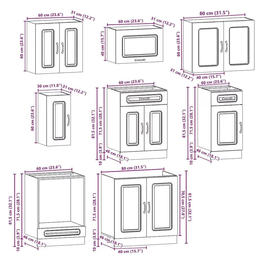 Ez a 8 darabos konyhaszekrény-garnitúra elegáns kialakításával optimalizálja a konyhateret, és bőséges tárolóhelyet biztosít személyes tárgyaidnak! Stabil és tartós anyag: A mesterséges fa tartós és stabil anyag, sima felülettel, amely ellenáll a nedvességnek, a vetemedésnek és a repedésnek, így megbízható választás számos projekthez.Bőséges tárolóhely: A konyhaszekrény-garnitúra számos rekesszel rendelkezik, és elegendő helyet kínál tálak, tányérok, edények és egyéb konyhai eszközök tárolására.Állítható lábak: Az alsó szekrények állítható lábakkal rendelkeznek, amelyek magassága a konyha elrendezéséhez igazítható.Könnyen karbantartható: Sima felületüknek köszönhetően ezek a konyhaszekrények könnyen tisztíthatók nedves ruhával, és kevesebb karbantartást igényelnek. Figyelmeztetés:A terméket munkalap beszerelésével kell rögzíteni. Jó Tudnivalók:A falon belüli csavar(ok) és tipli(k) nem tartozék(ok). Keressen és használjon a falához megfelelő csavar(oka)t és tipli(k)at. Ha bizonytalan, kérjen szakember tanácsát. Olvassa el és kövesse figyelmesen az utasítás minden lépését.A munkalap, a mosogató és a csaptelep nem része a szállítmánynak.