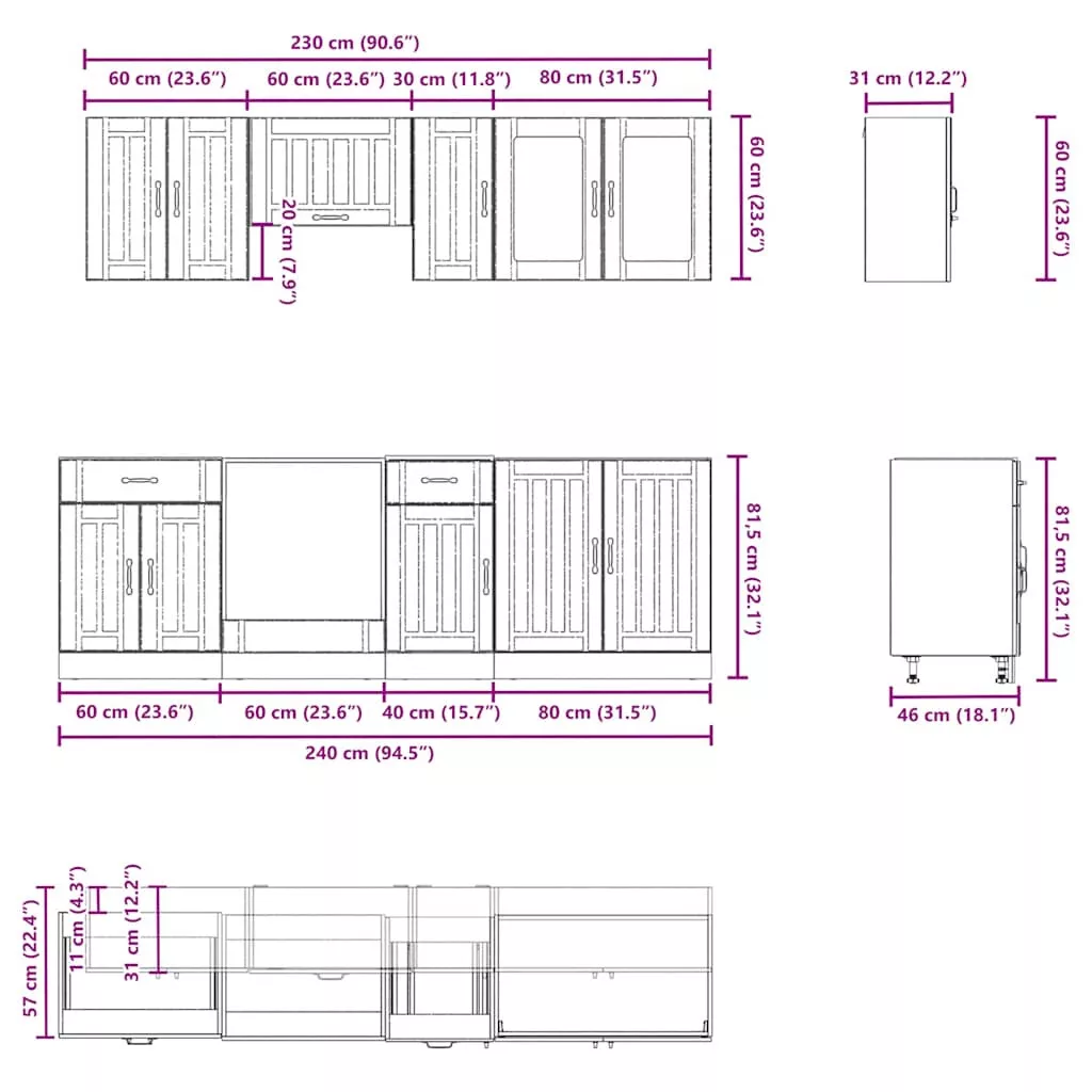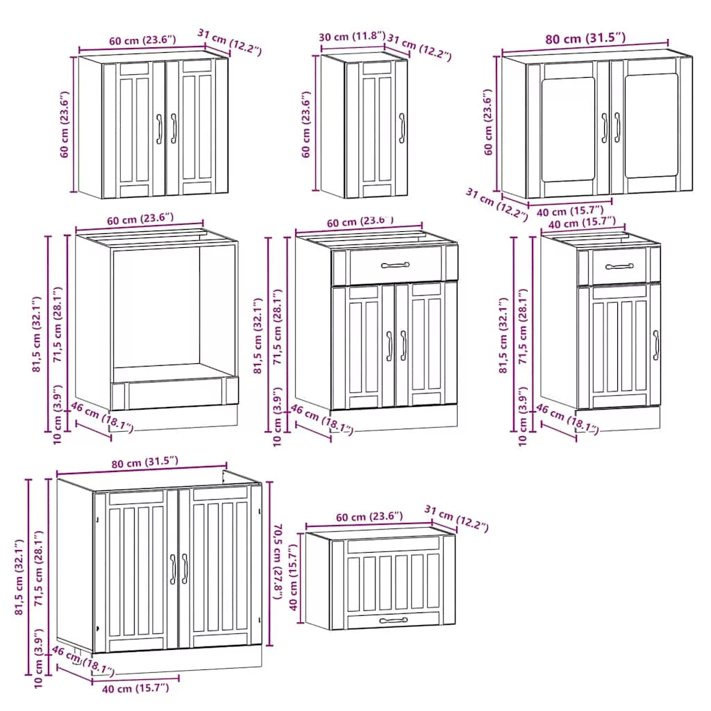 Ez a 8 darabos konyhaszekrény-garnitúra elegáns kialakításával optimalizálja a konyhateret, és bőséges tárolóhelyet biztosít személyes tárgyaidnak! Stabil és tartós anyag: A mesterséges fa tartós és stabil anyag, sima felülettel, amely ellenáll a nedvességnek, a vetemedésnek és a repedésnek, így megbízható választás számos projekthez.Bőséges tárolóhely: A konyhaszekrény-garnitúra számos rekesszel rendelkezik, és elegendő helyet kínál tálak, tányérok, edények és egyéb konyhai eszközök tárolására.Állítható lábak: Az alsó szekrények állítható lábakkal rendelkeznek, amelyek magassága a konyha elrendezéséhez igazítható.Könnyen karbantartható: Sima felületüknek köszönhetően ezek a konyhaszekrények könnyen tisztíthatók nedves ruhával, és kevesebb karbantartást igényelnek. Figyelmeztetés:A terméket munkalap beszerelésével kell rögzíteni. Jó Tudnivalók:A falon belüli csavar(ok) és tipli(k) nem tartozék(ok). Keressen és használjon a falához megfelelő csavar(oka)t és tipli(k)at. Ha bizonytalan, kérjen szakember tanácsát. Olvassa el és kövesse figyelmesen az utasítás minden lépését.A munkalap, a mosogató és a csaptelep nem része a szállítmánynak.