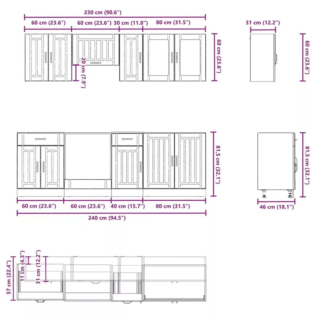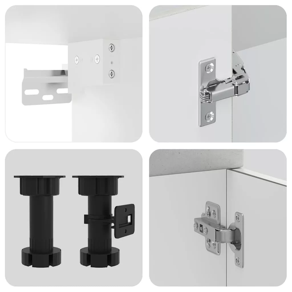 Ez a 8 darabos konyhaszekrény-garnitúra elegáns kialakításával optimalizálja a konyhateret, és bőséges tárolóhelyet biztosít személyes tárgyaidnak! Stabil és tartós anyag: A mesterséges fa tartós és stabil anyag, sima felülettel, amely ellenáll a nedvességnek, a vetemedésnek és a repedésnek, így megbízható választás számos projekthez.Bőséges tárolóhely: A konyhaszekrény-garnitúra számos rekesszel rendelkezik, és elegendő helyet kínál tálak, tányérok, edények és egyéb konyhai eszközök tárolására.Állítható lábak: Az alsó szekrények állítható lábakkal rendelkeznek, amelyek magassága a konyha elrendezéséhez igazítható.Könnyen karbantartható: Sima felületüknek köszönhetően ezek a konyhaszekrények könnyen tisztíthatók nedves ruhával, és kevesebb karbantartást igényelnek. Figyelmeztetés:A terméket munkalap beszerelésével kell rögzíteni. Jó Tudnivalók:A falon belüli csavar(ok) és tipli(k) nem tartozék(ok). Keressen és használjon a falához megfelelő csavar(oka)t és tipli(k)at. Ha bizonytalan, kérjen szakember tanácsát. Olvassa el és kövesse figyelmesen az utasítás minden lépését.A munkalap, a mosogató és a csaptelep nem része a szállítmánynak.