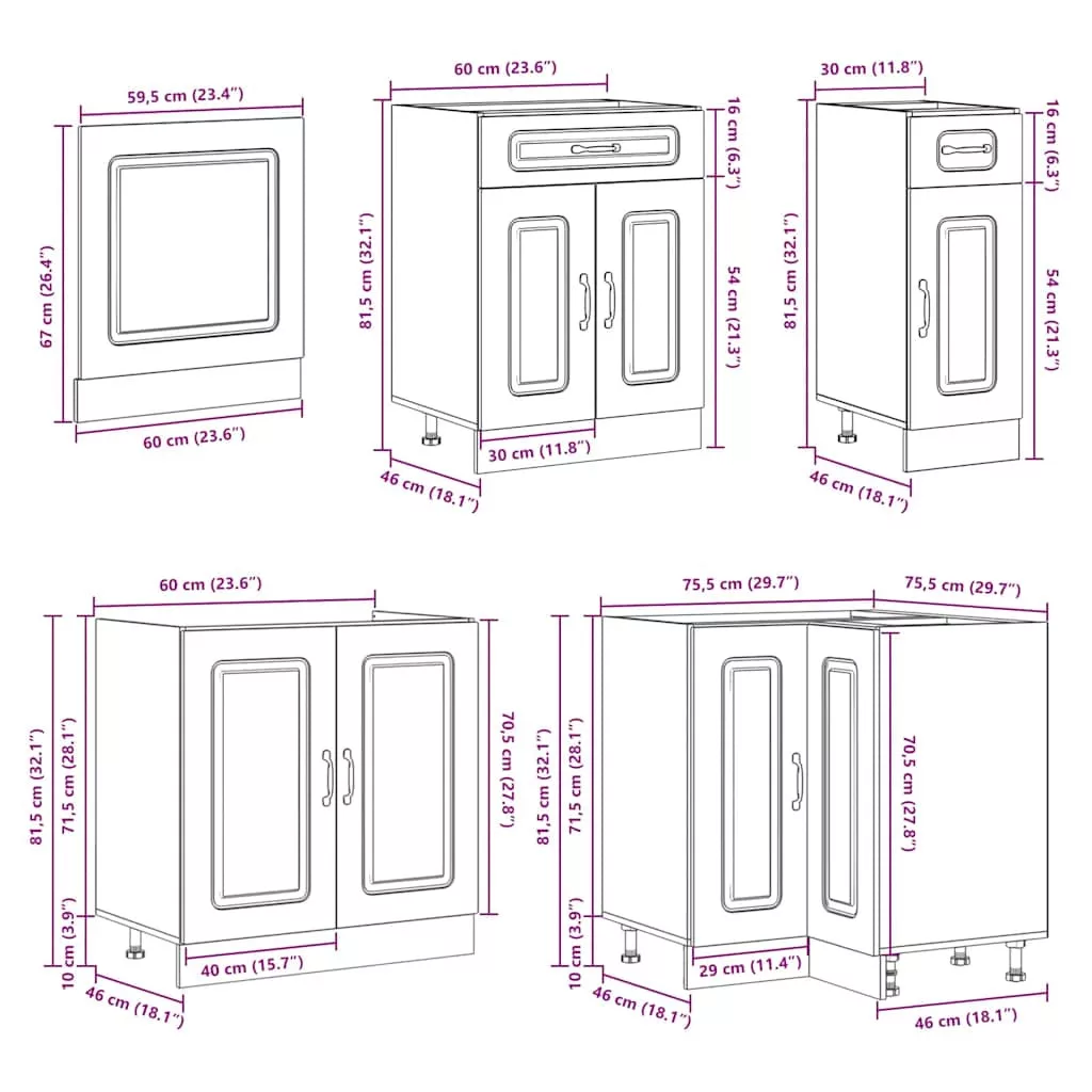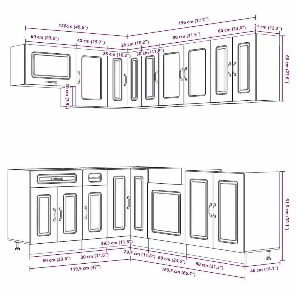 Ez az elegáns kialakítású, tizenegy részes konyhai szekrénygarnitúra optimalizálja konyhája terét, és bőséges tárolóhelyet biztosít személyes tárgyainak! Stabil és tartós anyag: A szerelt fa tartós és stabil anyag sima felülettel, amely ellenáll a nedvességnek, a vetemedésnek és a hasadásnak, így megbízható választás különféle célokhoz.Bőséges tárolóhely: A konyhaszekrénykészlet számos rekesszel rendelkezik, és elegendő helyet kínál tálak, tányérok, edények és egyéb konyhai eszközök tárolására.Állítható lábak: Az alsó szekrények állítható lábakkal rendelkeznek, amelyek magassága a konyha elrendezésének megfelelően állítható.Könnyen karbantartható: A sima felületnek köszönhetően ezek a konyhaszekrények könnyen tisztíthatók nedves ruhával, és kevesebb karbantartást igényelnek. Figyelem:A felborulás elkerülése érdekében ezt a terméket a mellékelt fali rögzítőeszközzel kell használni. Jó tudni:A falon belüli csavar(ok) és dugó(k) nem alaptartozékok. Keressen és használjon a falának megfelelő csavar(oka)t és dugó(ka)t. Ha bizonytalan, kérje szakember tanácsát. Gondosan olvassa el és kövesse a használati utasítás minden lépését.A munkalap, a mosogató és a csaptelep nem tartozéka a szállításnak.