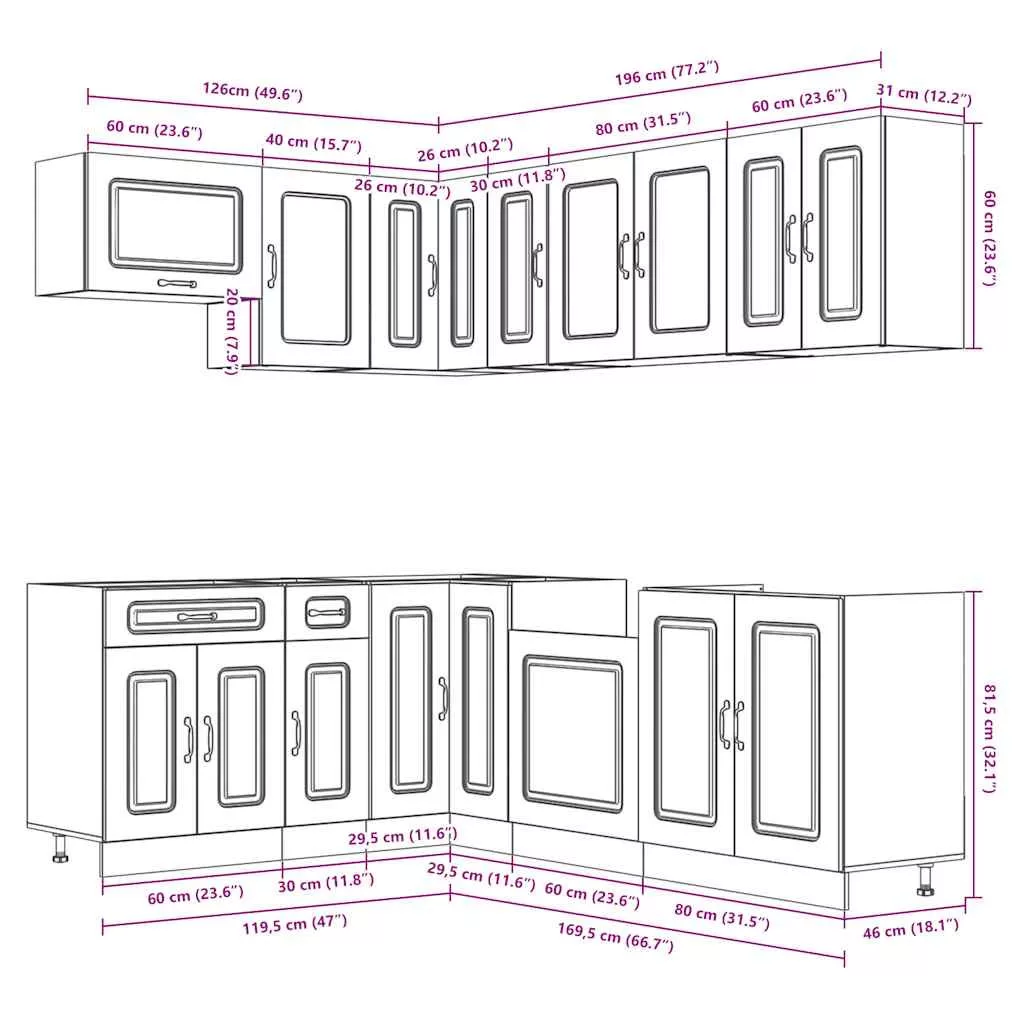 Ez az elegáns kialakítású, tizenegy részes konyhai szekrénygarnitúra optimalizálja konyhája terét, és bőséges tárolóhelyet biztosít személyes tárgyainak! Stabil és tartós anyag: A szerelt fa tartós és stabil anyag sima felülettel, amely ellenáll a nedvességnek, a vetemedésnek és a hasadásnak, így megbízható választás különféle célokhoz.Bőséges tárolóhely: A konyhaszekrénykészlet számos rekesszel rendelkezik, és elegendő helyet kínál tálak, tányérok, edények és egyéb konyhai eszközök tárolására.Állítható lábak: Az alsó szekrények állítható lábakkal rendelkeznek, amelyek magassága a konyha elrendezésének megfelelően állítható.Könnyen karbantartható: A sima felületnek köszönhetően ezek a konyhaszekrények könnyen tisztíthatók nedves ruhával, és kevesebb karbantartást igényelnek. Figyelem:A felborulás elkerülése érdekében ezt a terméket a mellékelt fali rögzítőeszközzel kell használni. Jó tudni:A falon belüli csavar(ok) és dugó(k) nem alaptartozékok. Keressen és használjon a falának megfelelő csavar(oka)t és dugó(ka)t. Ha bizonytalan, kérje szakember tanácsát. Gondosan olvassa el és kövesse a használati utasítás minden lépését.A munkalap, a mosogató és a csaptelep nem tartozéka a szállításnak.