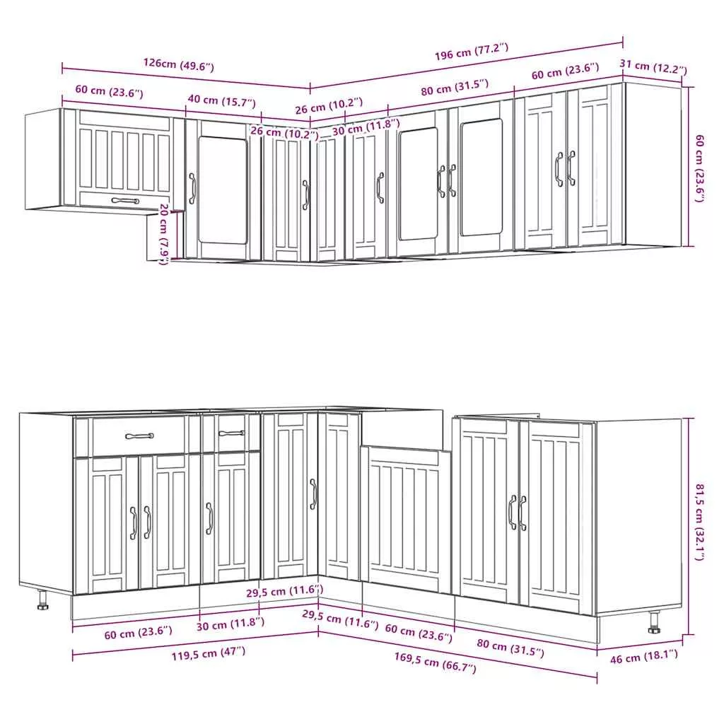 Ez az elegáns kialakítású, tizenegy részes konyhai szekrénygarnitúra optimalizálja konyhája terét, és bőséges tárolóhelyet biztosít személyes tárgyainak! Stabil és tartós anyag: A szerelt fa tartós és stabil anyag sima felülettel, amely ellenáll a nedvességnek, a vetemedésnek és a hasadásnak, így megbízható választás különféle célokhoz.Bőséges tárolóhely: A konyhaszekrénykészlet számos rekesszel rendelkezik, és elegendő helyet kínál tálak, tányérok, edények és egyéb konyhai eszközök tárolására.Állítható lábak: Az alsó szekrények állítható lábakkal rendelkeznek, amelyek magassága a konyha elrendezésének megfelelően állítható.Könnyen karbantartható: A sima felületnek köszönhetően ezek a konyhaszekrények könnyen tisztíthatók nedves ruhával, és kevesebb karbantartást igényelnek. Figyelem:A felborulás elkerülése érdekében ezt a terméket a mellékelt fali rögzítőeszközzel kell használni. Jó tudni:A falon belüli csavar(ok) és dugó(k) nem alaptartozékok. Keressen és használjon a falának megfelelő csavar(oka)t és dugó(ka)t. Ha bizonytalan, kérje szakember tanácsát. Gondosan olvassa el és kövesse a használati utasítás minden lépését.A munkalap, a mosogató és a csaptelep nem tartozéka a szállításnak.