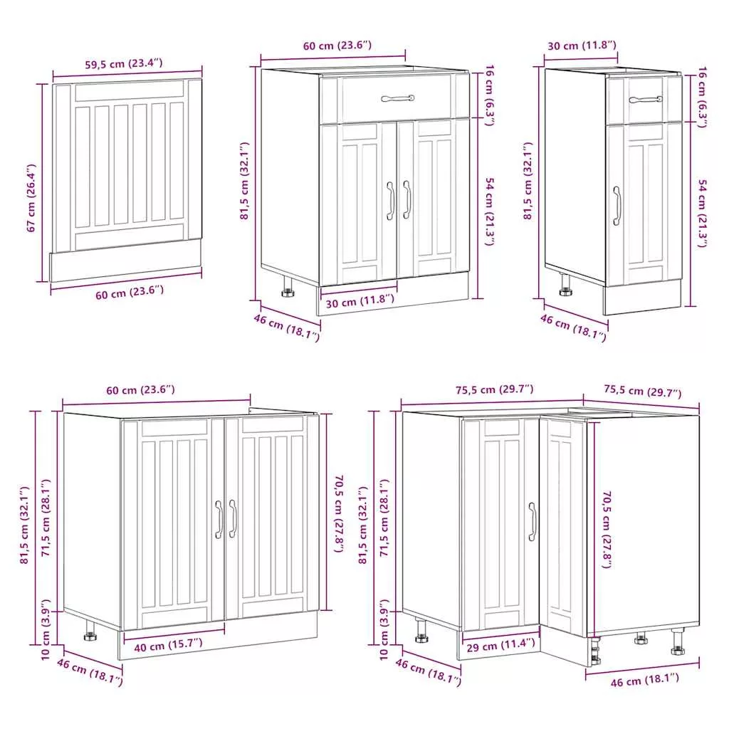 • 1 x konyhai sarokszekrény: 75,5 x 75,5 x 81,5 cm (Sz x D x K)